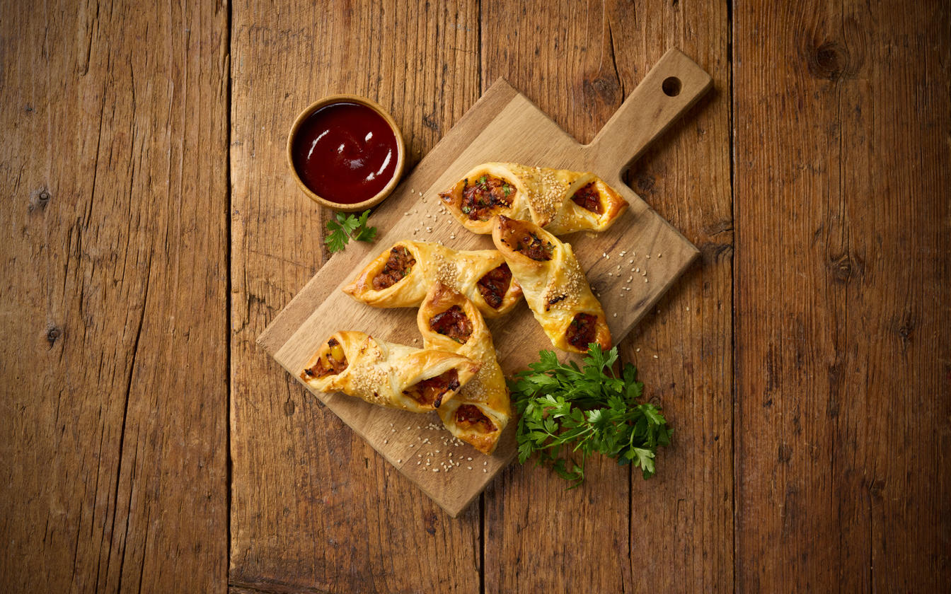 Disse butterdejshapsere med pulled pork er små, smagfulde mundfulde, der er perfekte som en snack, appetizer eller som en del af en tapas-anretning. Fyldet består af saftig pulled pork vendt i barbecuesauce, toppet med peberfrugt, persille og smeltet cheddar – alt sammen pakket ind i sprød butterdej og drysset med sesam. En oplagt opskrift til både gæstemad og hyggelige hverdage.