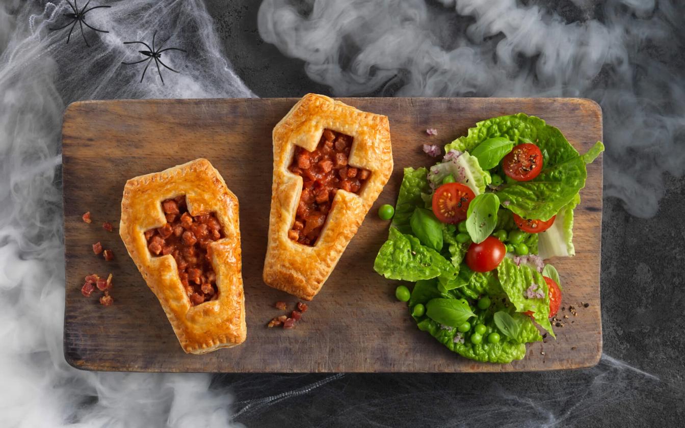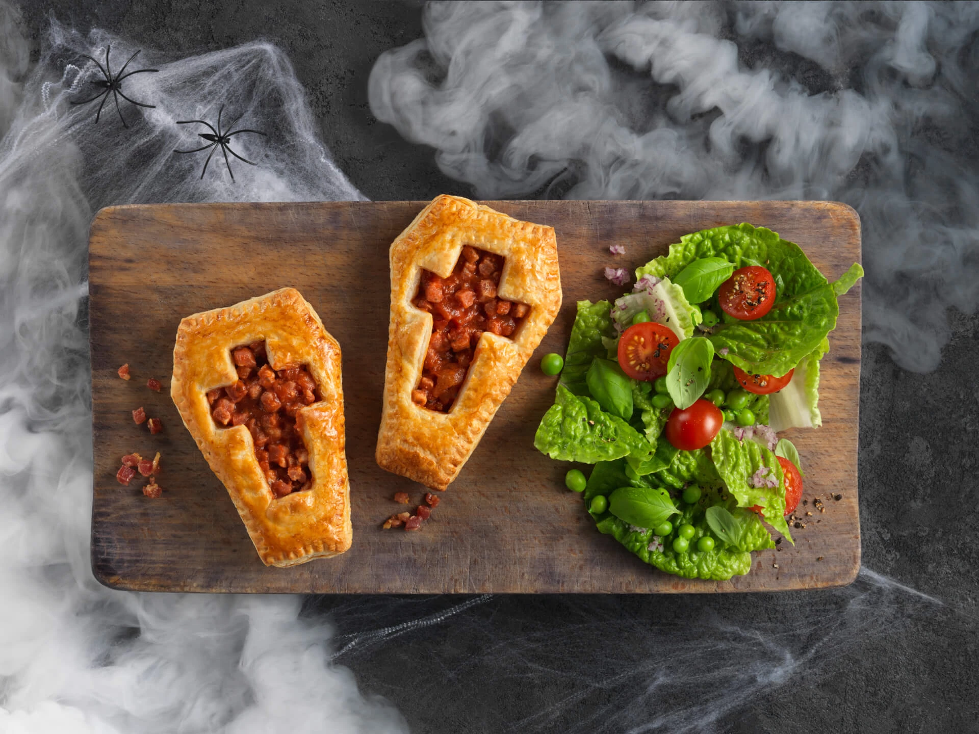 Kisterne her er et kreativt og anderledes indslag til Halloween, og minder rigtig meget om pirogger. I denne opskrift har vi fyldt kisterne med bacon og tomatsauce, hvilet smager vidunderligt sammen.Når du samler kisterne, er det vigtigt, at du husker at pensle kanten med æg, hvorefter du kan presse kanterne sammen med en gaffel.