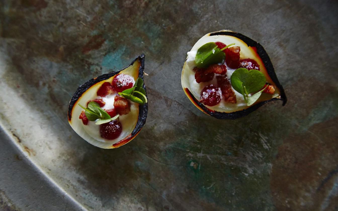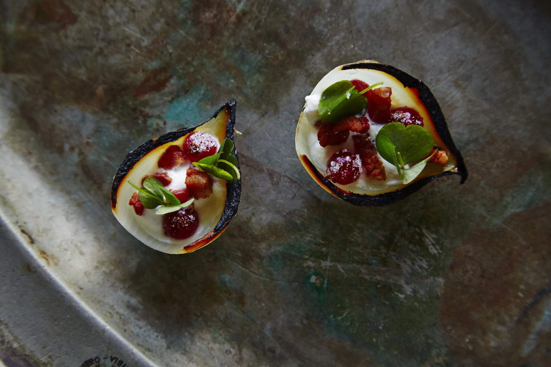 Halve løg med sursøde ribs, sprød bacon og flødefyld
