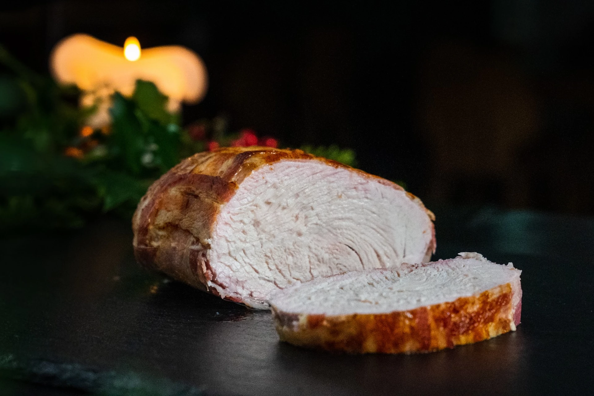 Kalkunbryst med bacon er en smagfuld ret, hvor saftige kalkunstykker krydres med rosmarin og enebær, pakkes ind i sprød bacon og serveres med bagte søde kartofler og en frisk quinoasalat med granatæble. En lækker kombination af krydret, sprødt og friskt – perfekt til både hverdag og gæster.