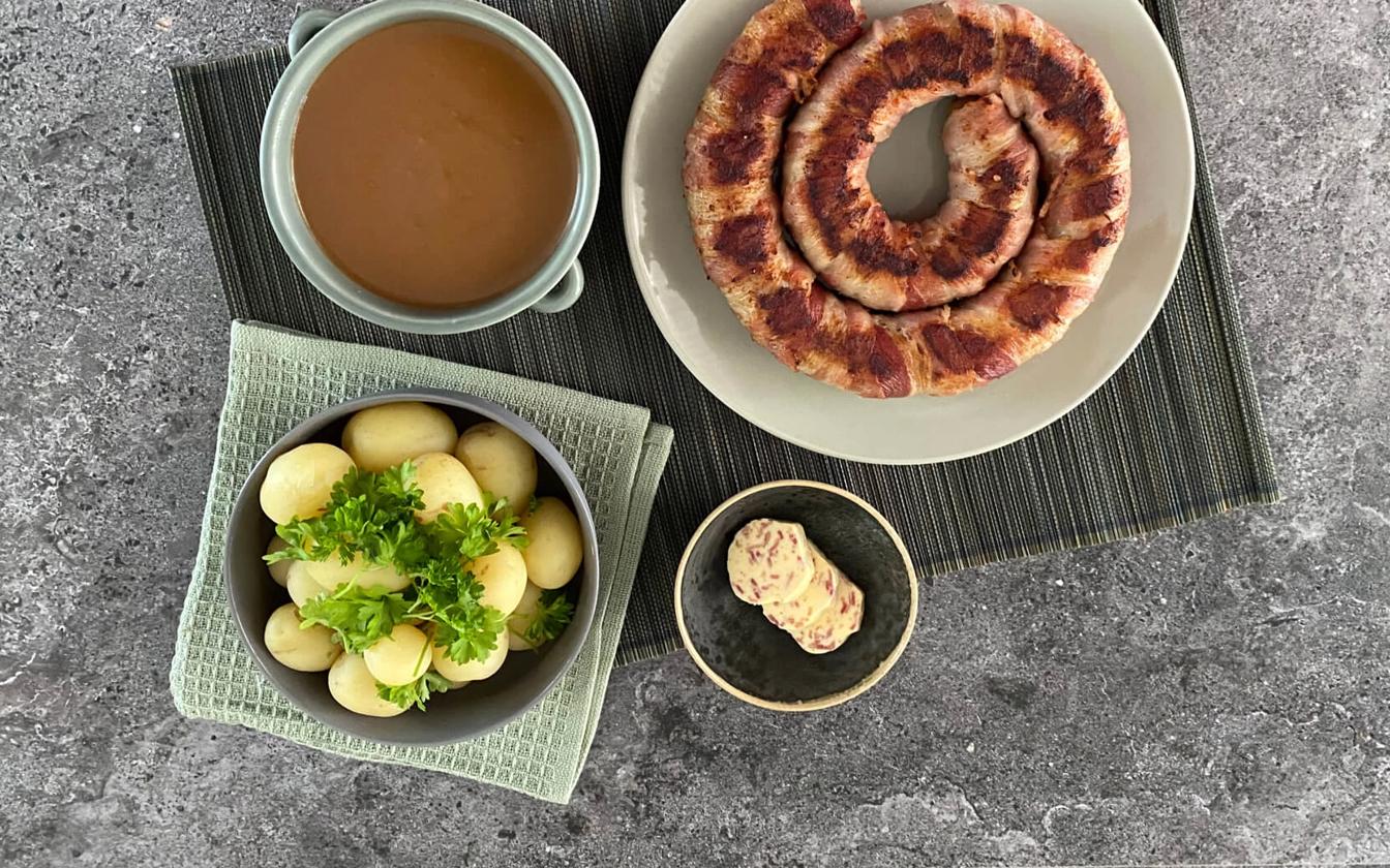 Kartofler med persille og baconsmør er en enkel, men smagfuld klassiker, hvor det sprøde og salte smør med bacon løfter de kogte kartofler til nye højder. Perfekt som tilbehør til både hverdagsretter og weekendmiddage – og særligt god, når den varme baconsmør smelter ned over de dampende kartofler.