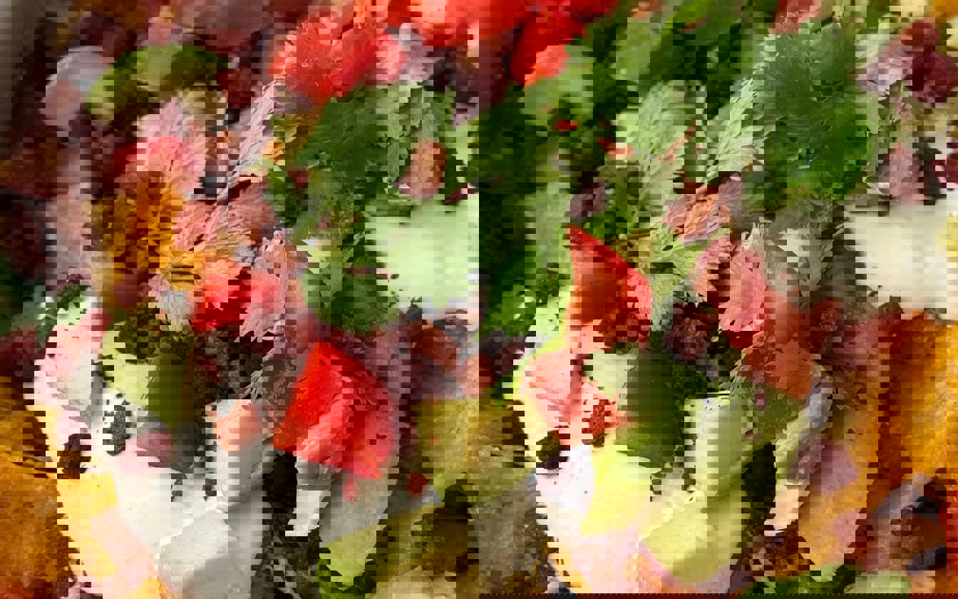 Loaded nachos med bacon er den ultimative snack, perfekt til deling med venner og familie. Sprøde tortillachips toppes med en lækker blanding af sprødstegt bacon, krydrede løg, smeltet cheddar og friske toppings som avocado, tomat og jalapeños. En nem og velsmagende ret, der passer perfekt til hyggelige aftener, fester eller som en lækker snack til filmaftenen.