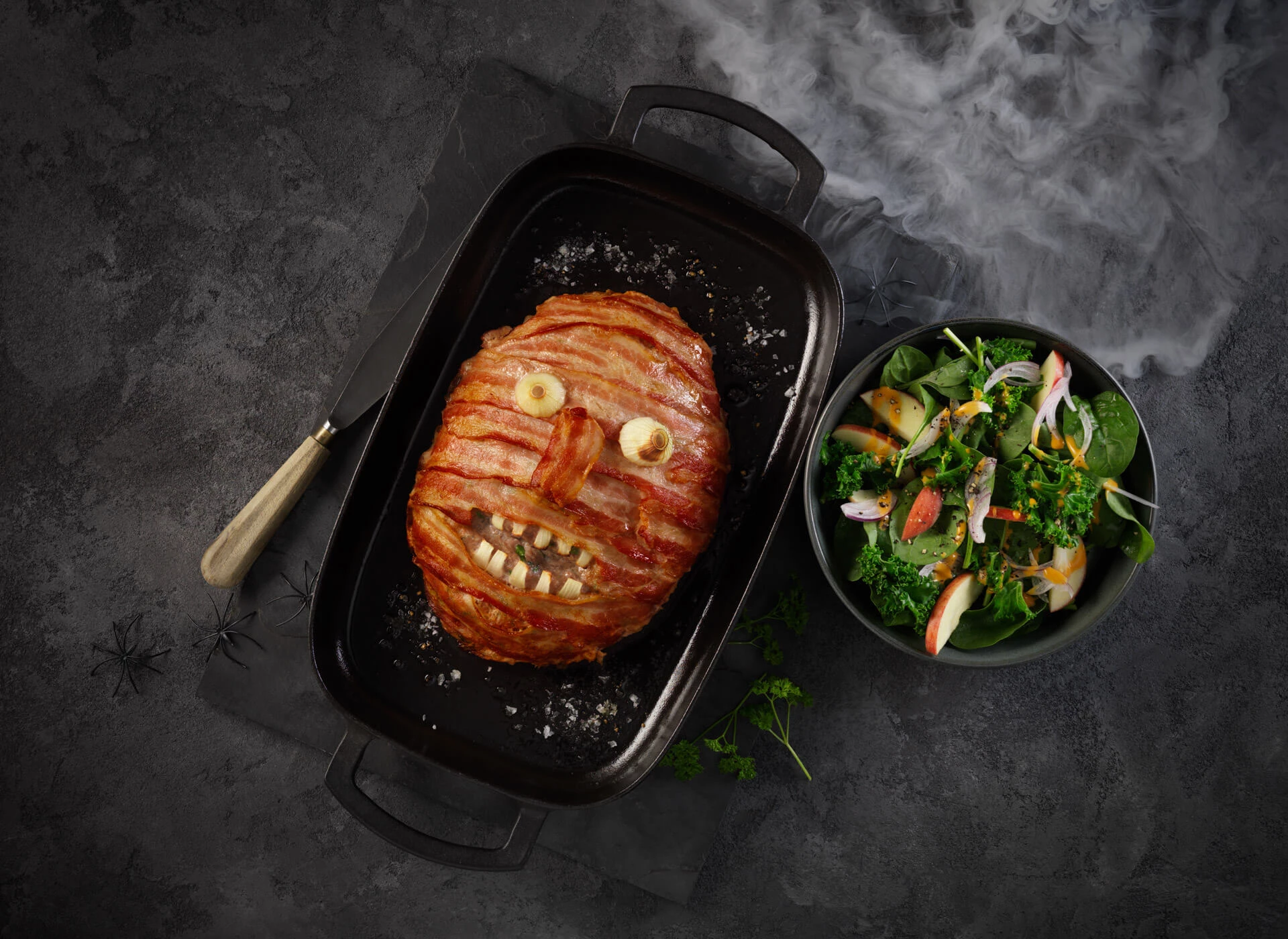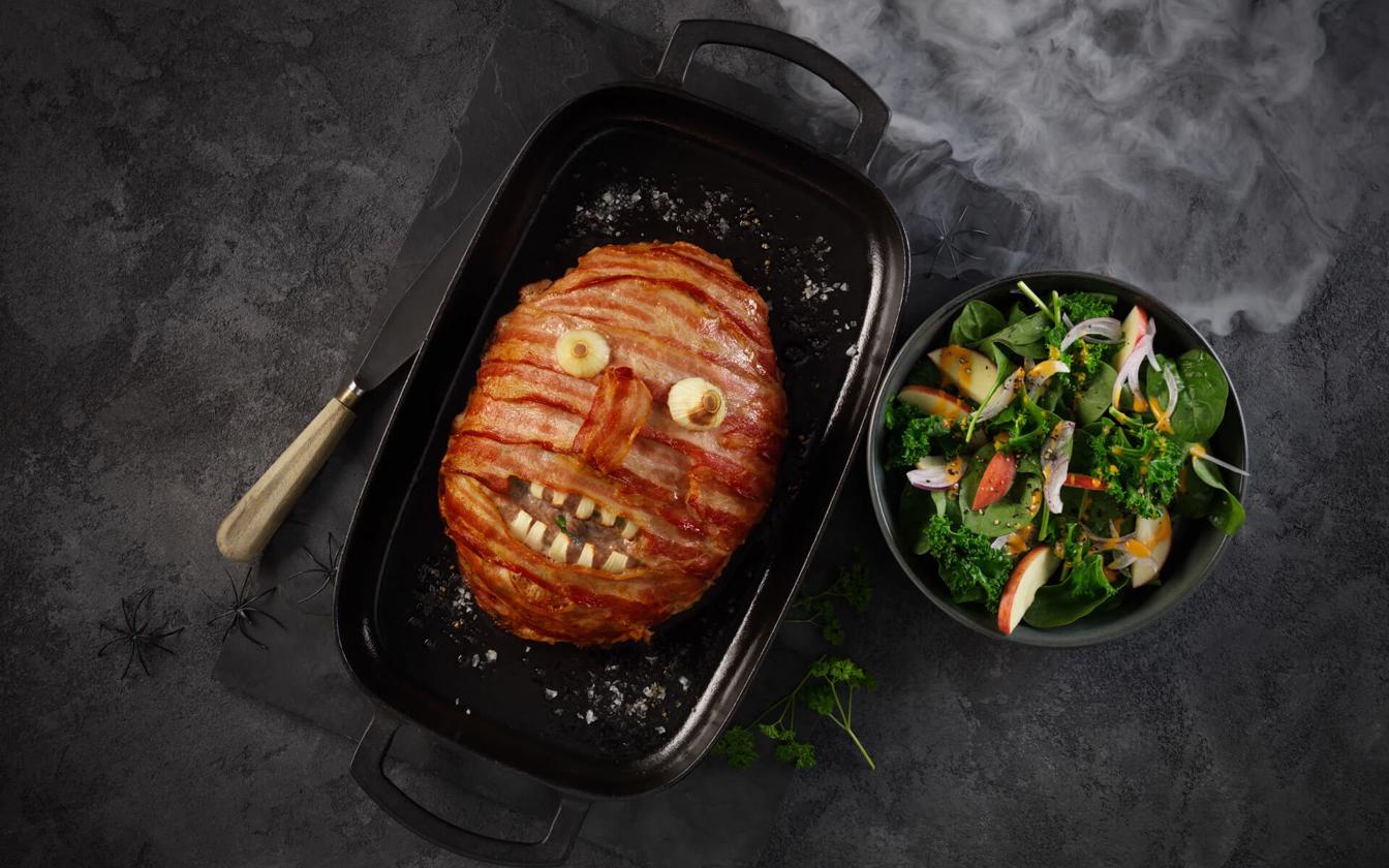 Denne uhyggelige servering består af et klassisk farsbrød svøbt med smagfulde baconskiver. Denne servering er et virkelig sjovt indslag til fx Halloweenfesten for både børn og voksne. Den velkendte kombination af fars og bacon appellerer bredt og smager fantastisk.