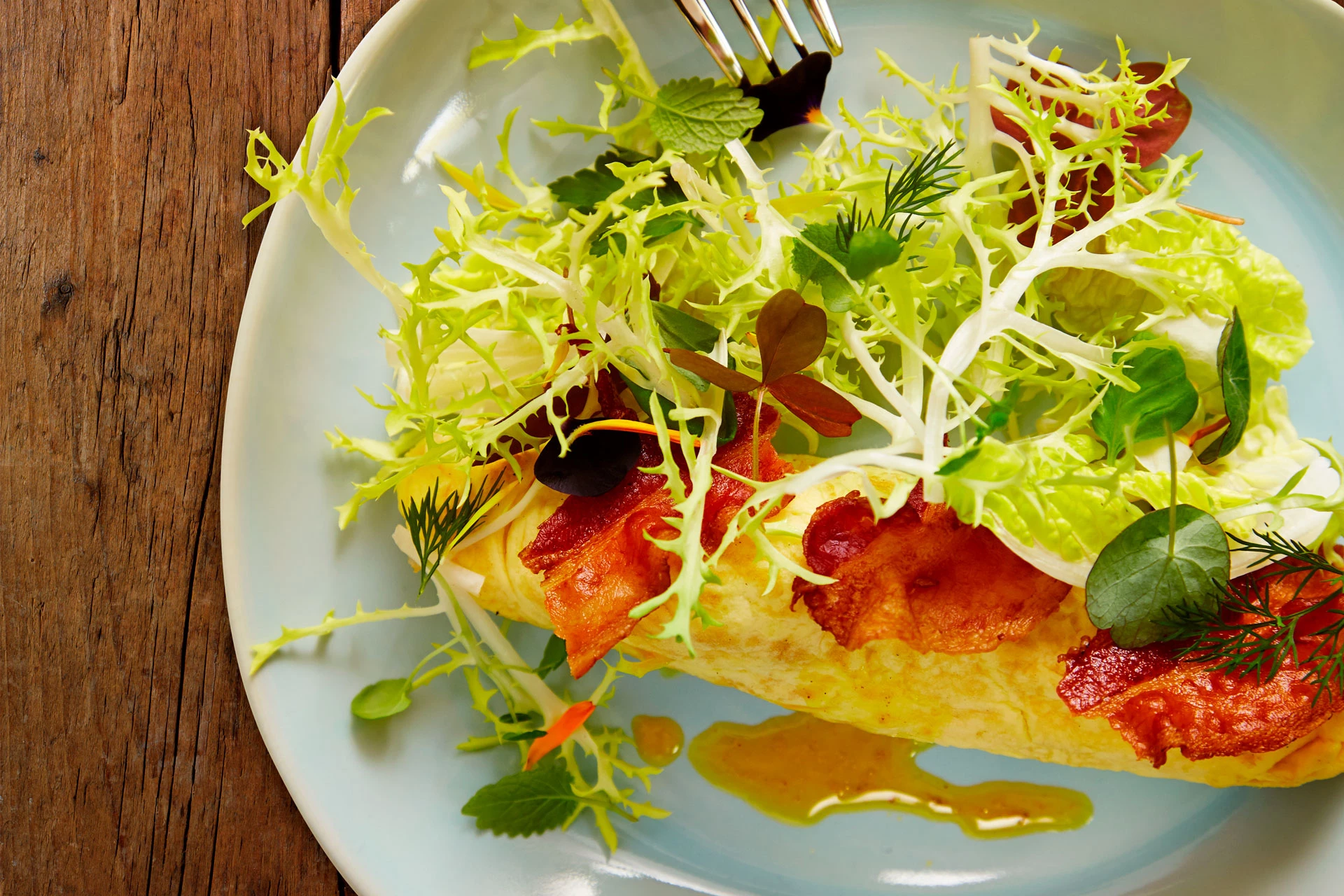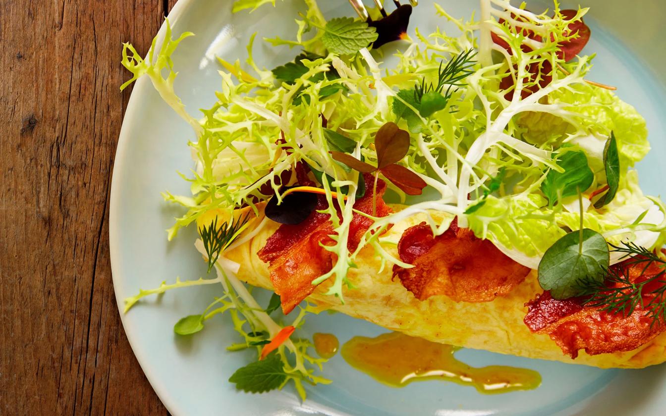 - Vælger du at servere omelet til brunch, foreslår vi, at du laver små portionsanrettede omeletter med bacon. Det er både hyggeligt og kan anrettes pænt. Derudover giver det plads til flere små retter - sørg for både at have søde og salte smage på brunchbordet.
