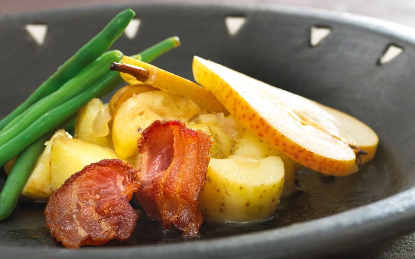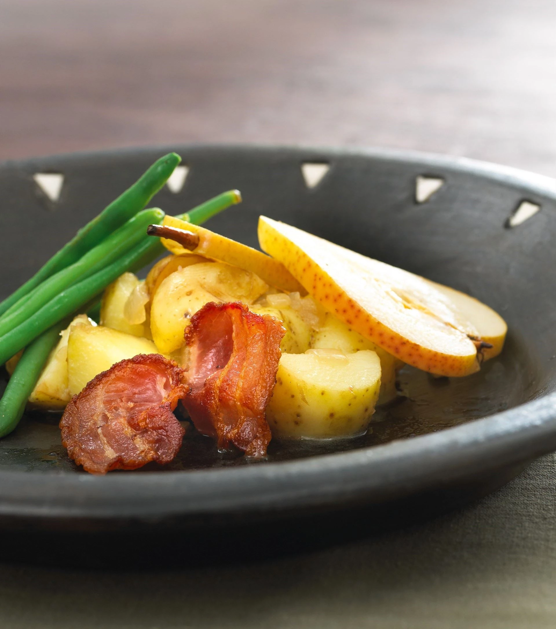 Den tyske ret "Birnen, Bohnen und Speck" smager godt. Man kan ligefrem fornemme smagen, når man hører ordene. Den traditionelle nordtyske ret er opstået i sensommeren, hvor pærerne var modne og bønnerne høstklare, samtidig med tørringen og rygningen af grisekødet til vinteren. På tallerkenen mødes den røgede, salte smag med pærernes sødme og den syrlige marinade på bønnerne.