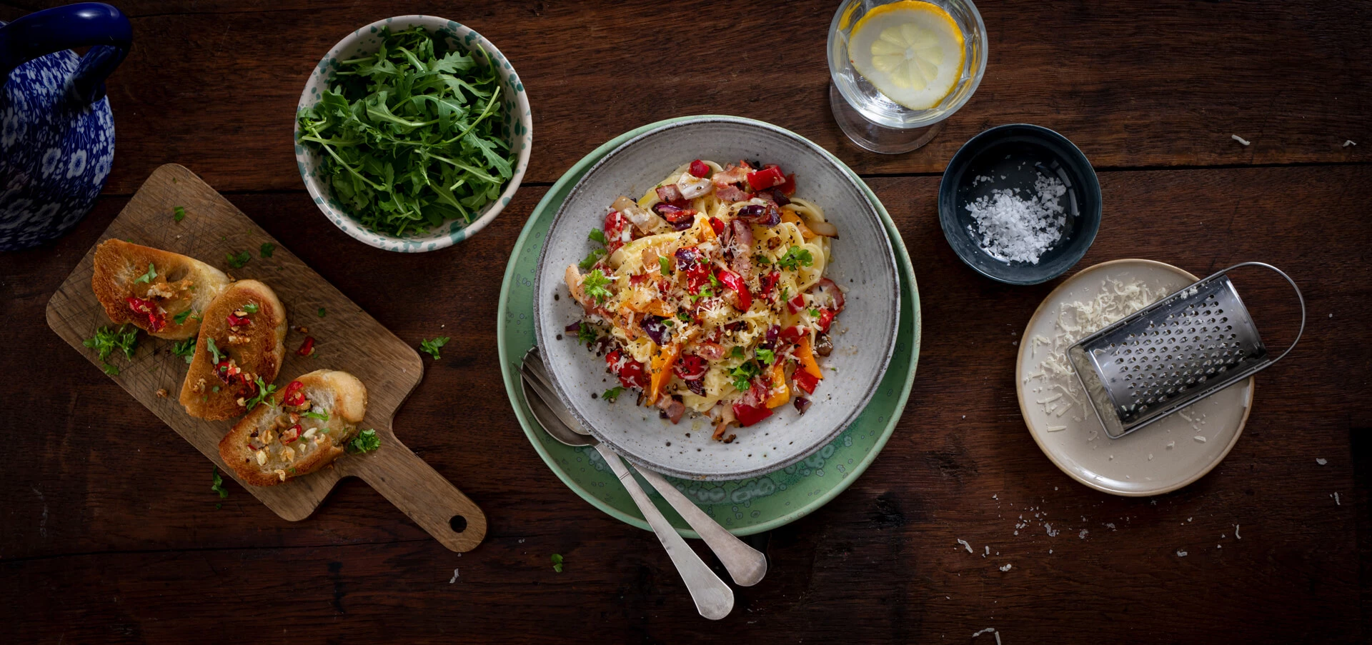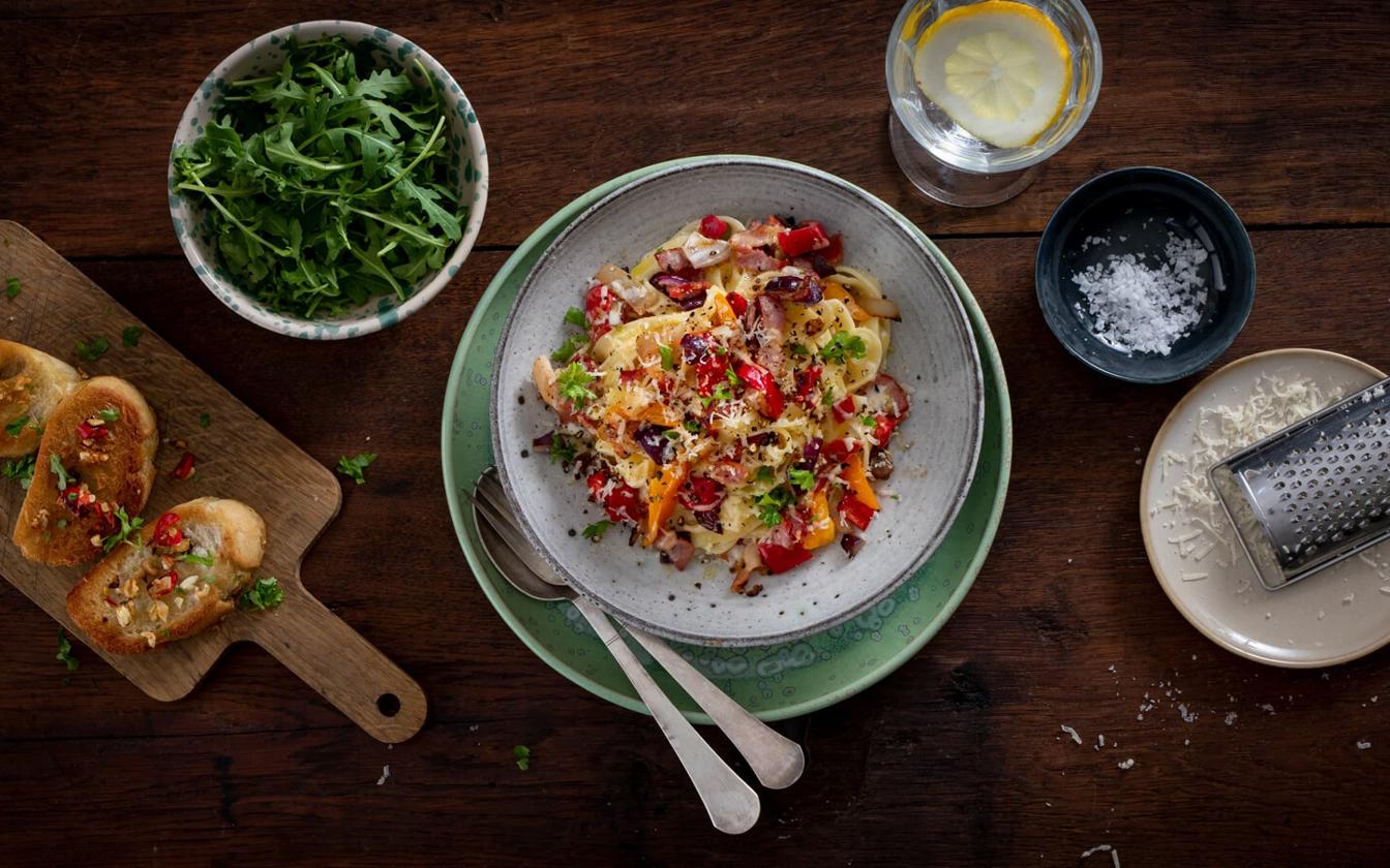 Der er ikke noget, der slår en lækker pastaret – især når den samtidig er super nem at tilberede. I denne version har vi blandet peberfrugt, rødløg og svampe med sprødt bacon i en cremet flødesovs, som binder alle smagene sammen på bedste vis. Kombinationen af friske grøntsager og fyldig sauce gør retten både farverig og velsmagende, og den vil med garanti falde i god jord hos både familie og gæster. Det er en ret, der passer til hverdagens travleste dage, men som også fungerer rigtig godt som weekendaftens komfortmad. Nyd den som den er – eller top med lidt ekstra parmesan og friske krydderurter for et ekstra pift.