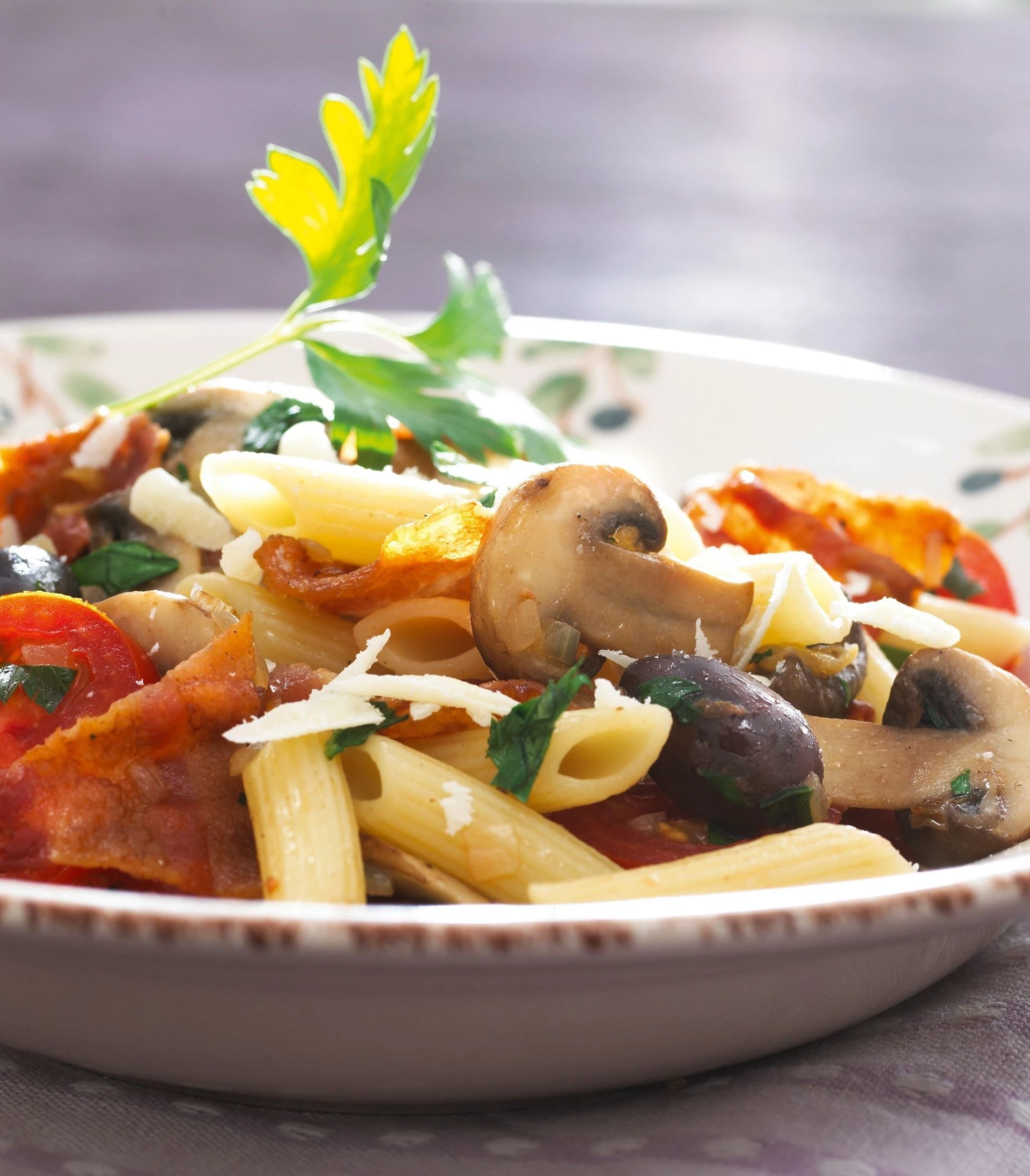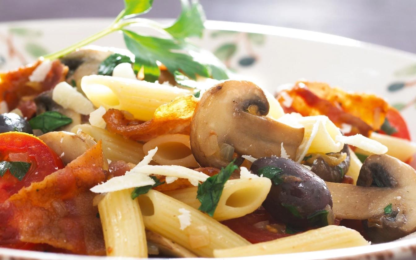 Svampe i form af champignoner er en smagsgivende og sublim råvare sammen med bacon og pasta. Kombinationen med tomater, hvidløg, oliven og parmesanost giver mange smagsindtryk og smelter sammen til en helhed. Retten kan varieres med mere eller mindre af de valgte råvarer, og man kan skabe sin egen favoritkombination.