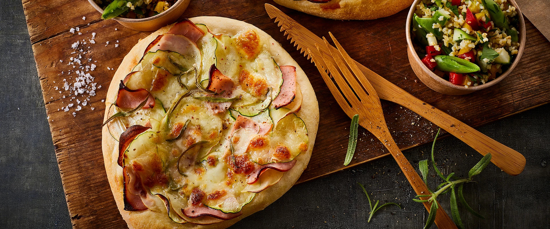 I opskriften har vi taget den traditionelle, store pizza og delt den i fire, så pizzaerne bliver mindre og mere madpakke-venlige. Oven på pizzaen finder du kartoffel, rosmarin, squash, cremet mozzarella og en lækker salt skinke. Den perfekte madpakke kombination!