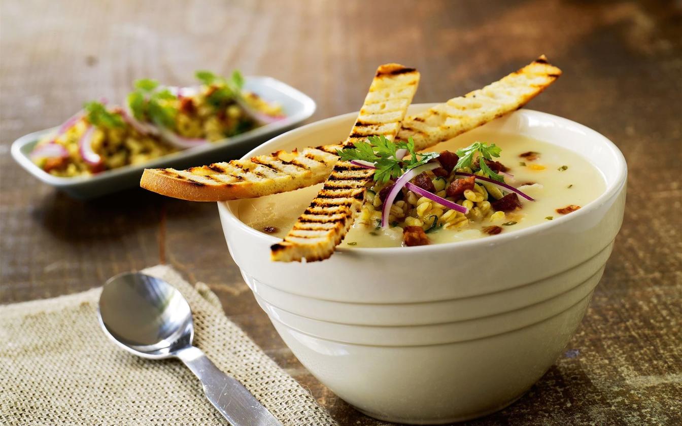 Rodfrugtsuppe med hvedekerner og bacon