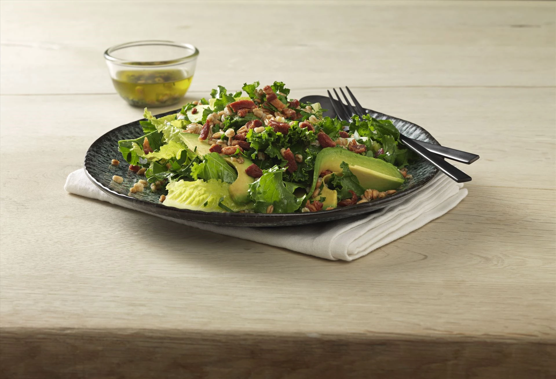Salat med grønkål, avokado og bacon vinargrette