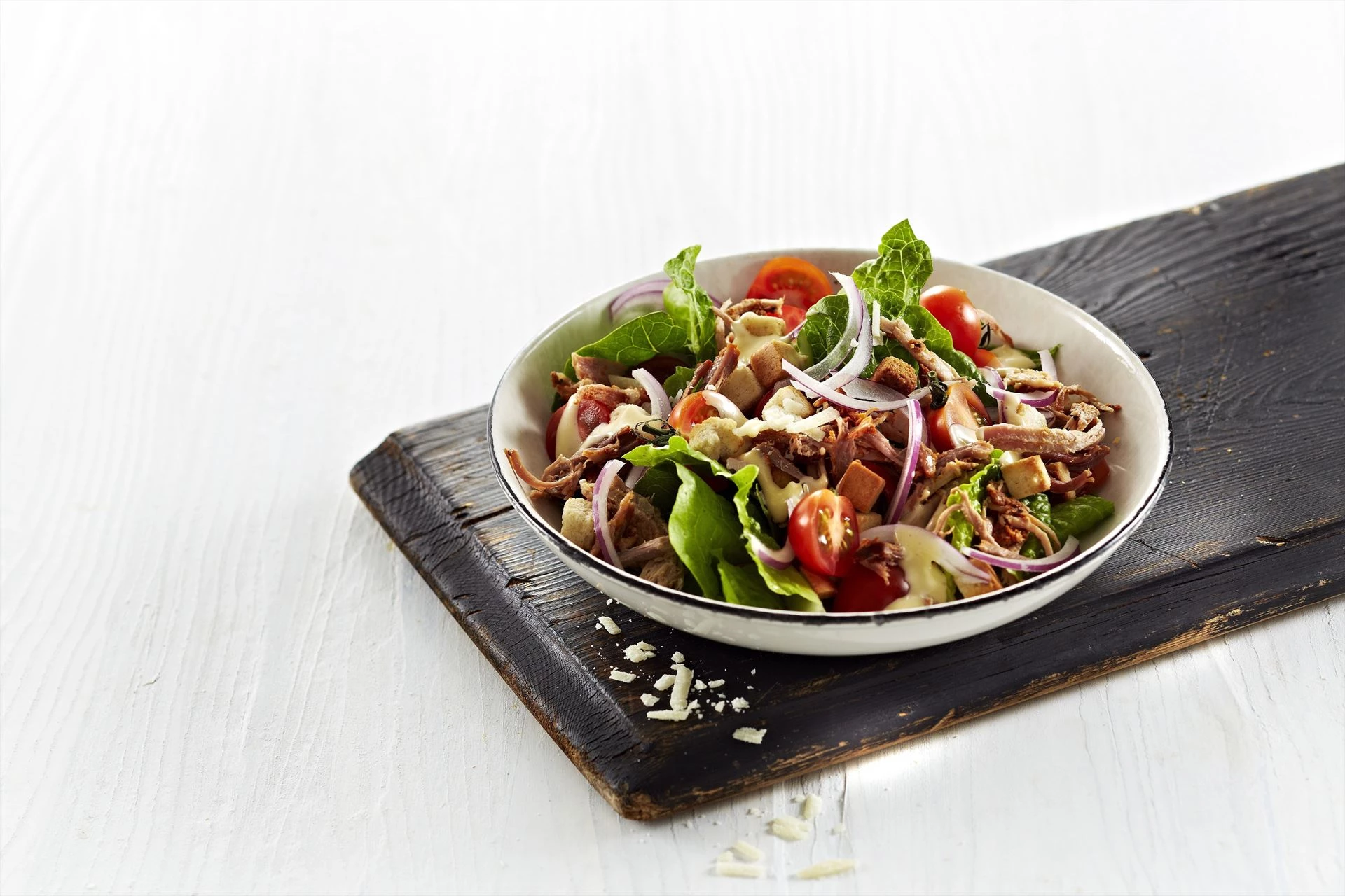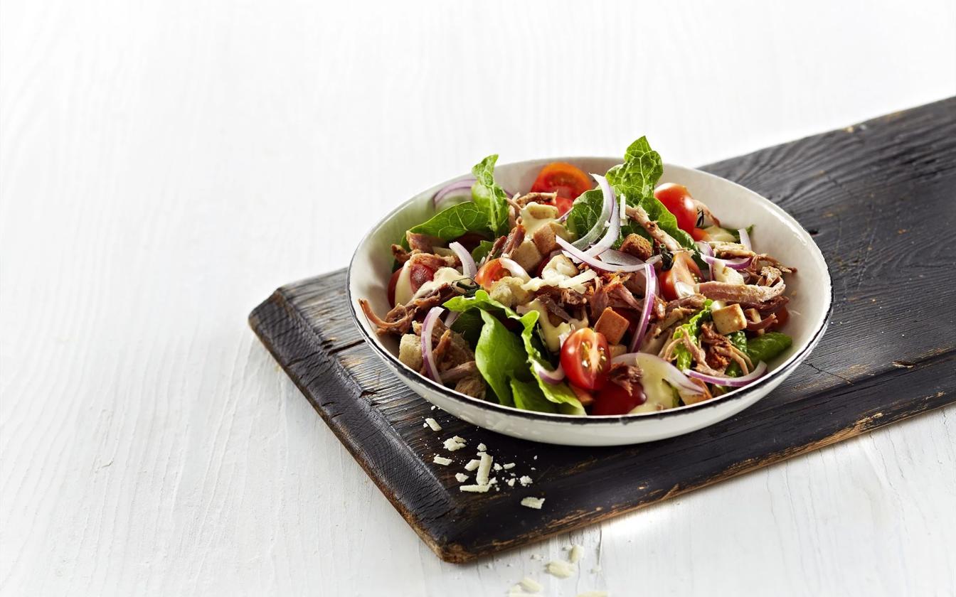 Her har du opskriften på en fyldig salat med sprøde hvidløgscroutoner, parmesan, en hjemmerørt aioli-dressing og mørt pulled pork. Udover at smage himmelsk, tager opskriften her heller ikke lang tid at lave. Med vores langtidstilberedte pulled pork sparer du nemlig masser af tid, men får den samme gode smag. Salaten skal altså bare skæres og vendes sammen med dressingen, og så skal pulled porken i. Vupti – så har du en nem og lækker aftensmad.
