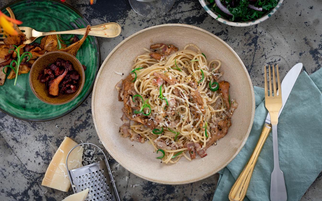 Spaghetti med kantareller og bacon
