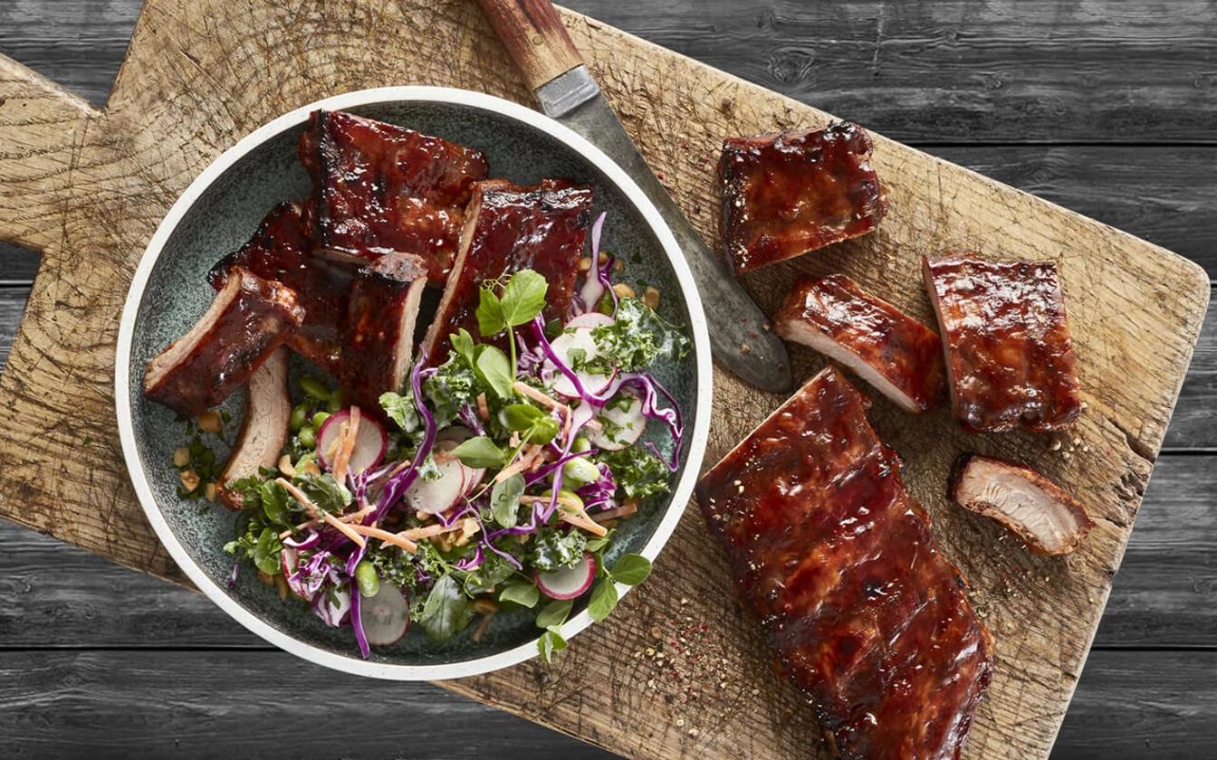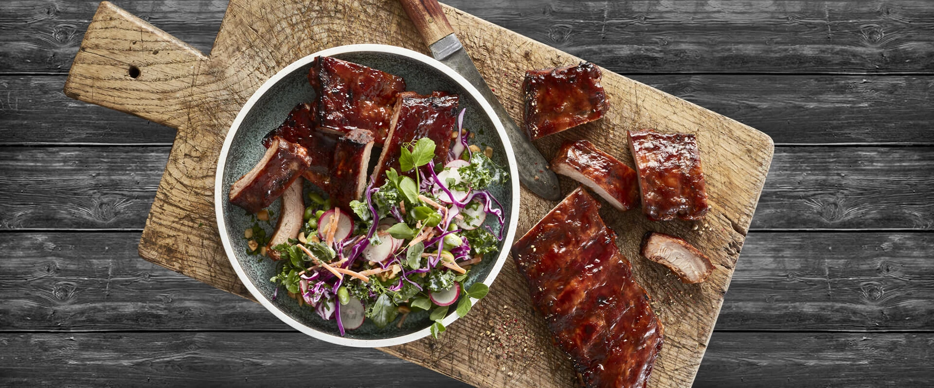 Vi har anrettet middagen med farverigt spareribs tilbehør: En coleslaw lavet på sprød grønkål og spidskål, edamamebønner, gulerødder og radiser. Retten toppes med letristede peanuts og frisk persille.