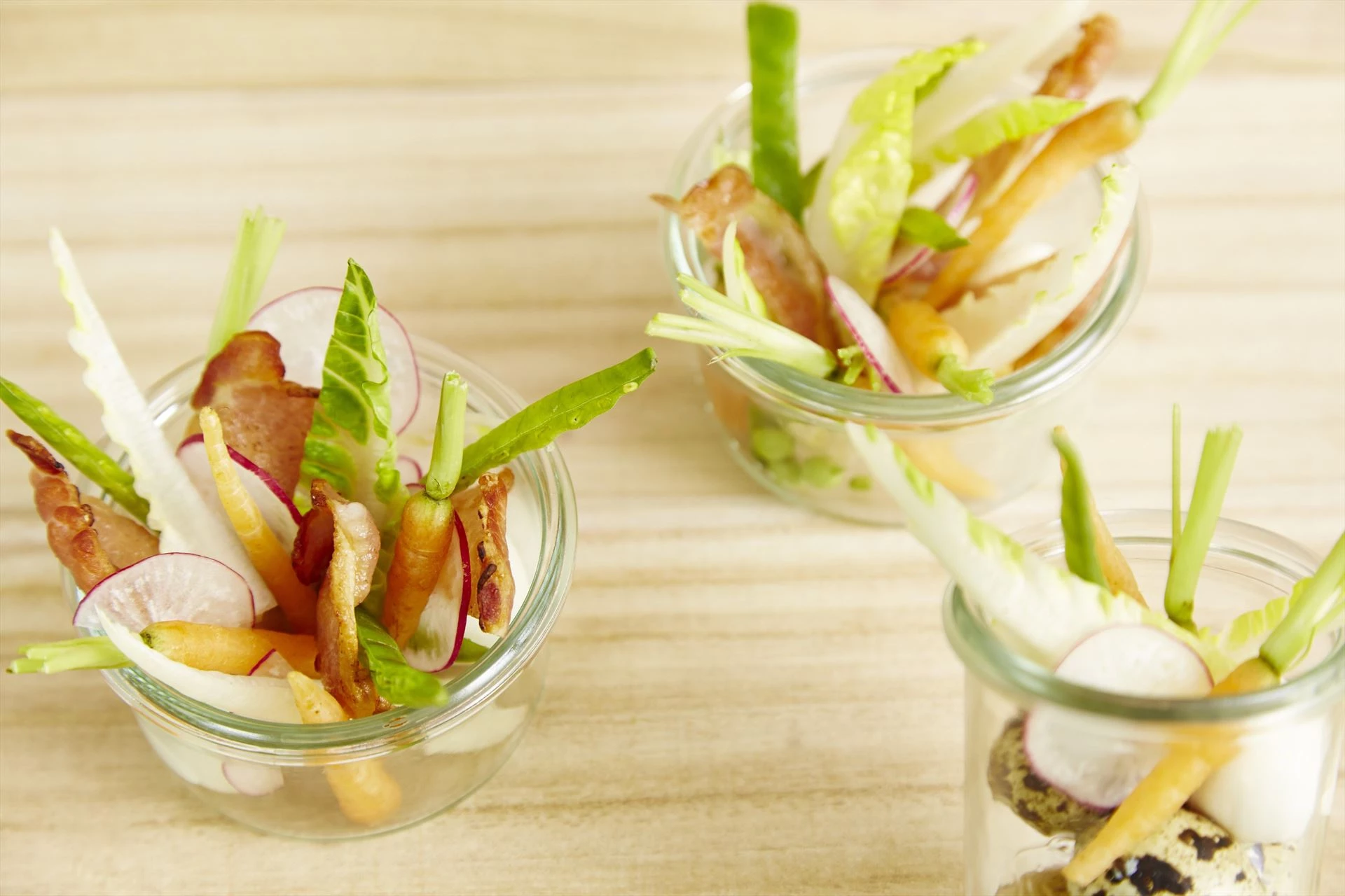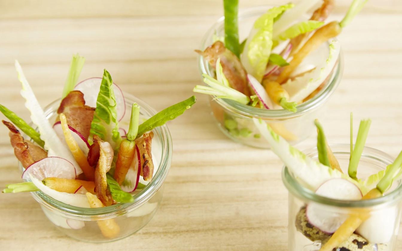 Denne snack er lækker velegnet til børn: vagtelæg med sprødstegt bacon, serveret med frisk salat. Denne lækre kombination af den delikate smag fra vagtelæg og den røgede bacon skaber en lækker forret eller snack, der vil vil glæde både børn og voksne.