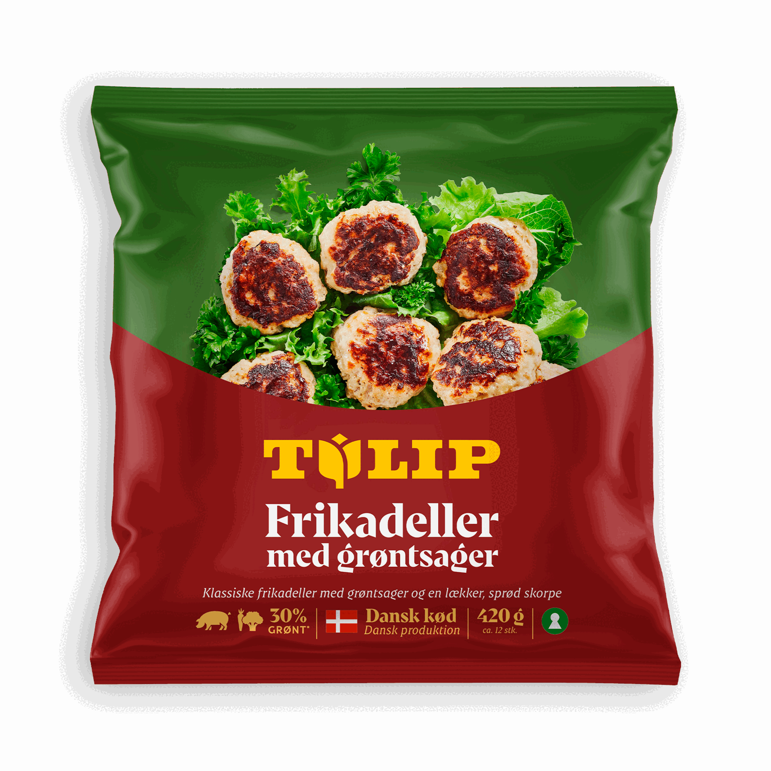 420 gTulip Frikadeller med grønt smager som havde du lavet dem selv. De er rørt af nøje udvalgte råvarer og tilsat 30% grøntsager, formet og pandestegte, så de har fået en sprød og lækker stegeskorpe.