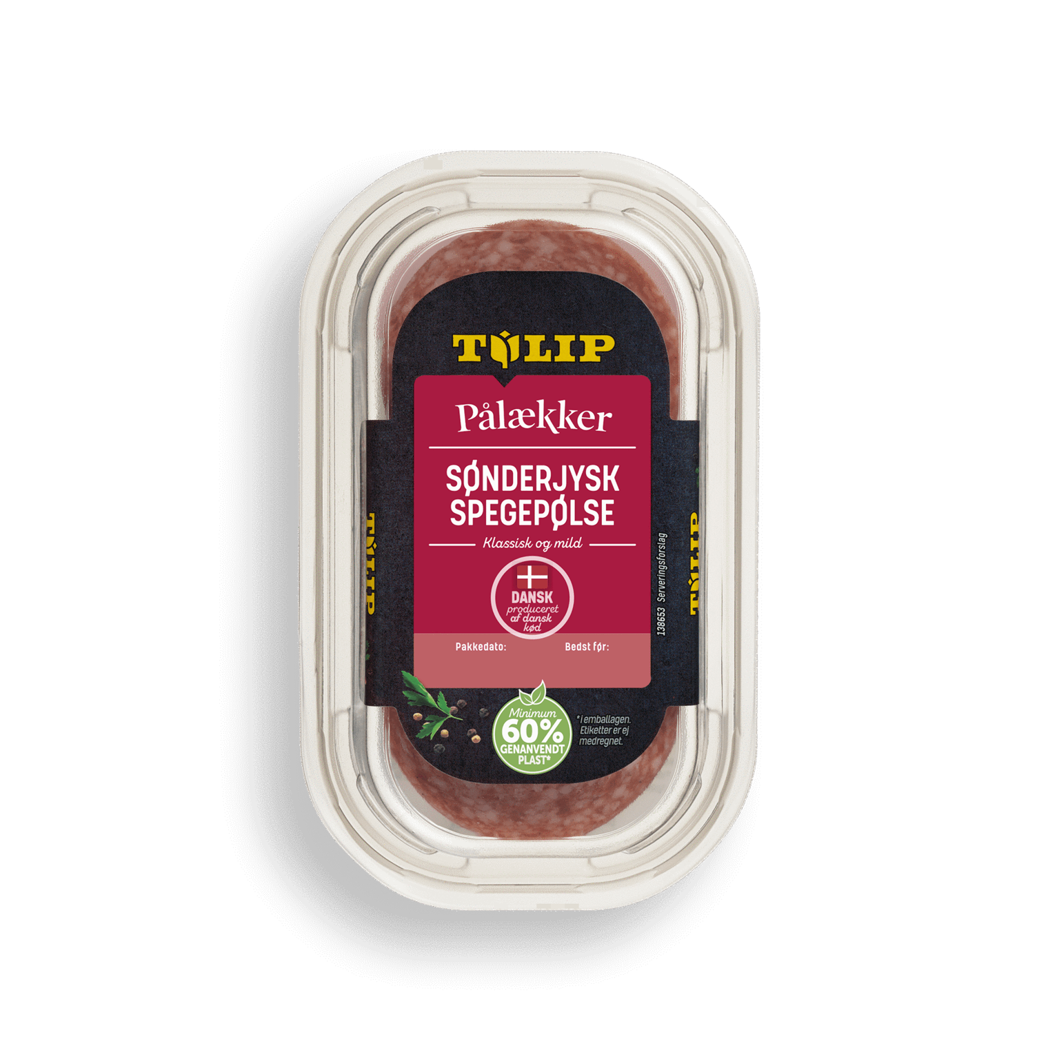 125 gTulip Pålækker Sønderjysk Spegepølse er lavet med udgangspunkt i godt dansk kød og en traditionsrig opskrift - det bedste fundament for en spegepølse af høj kvalitet. En velsmagende klassiker, der er røget over bøgeflis og selvfølgelig skåret i tykkere skiver.