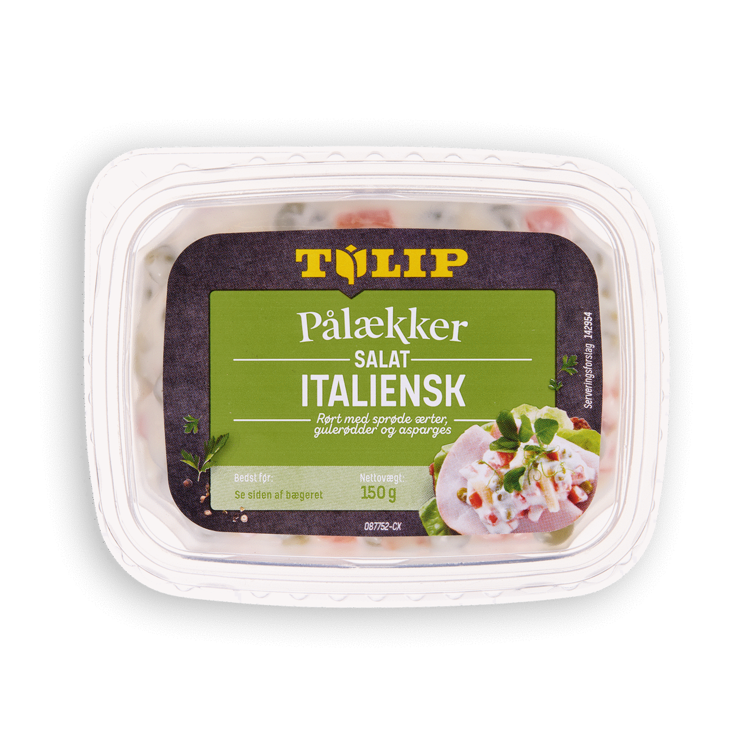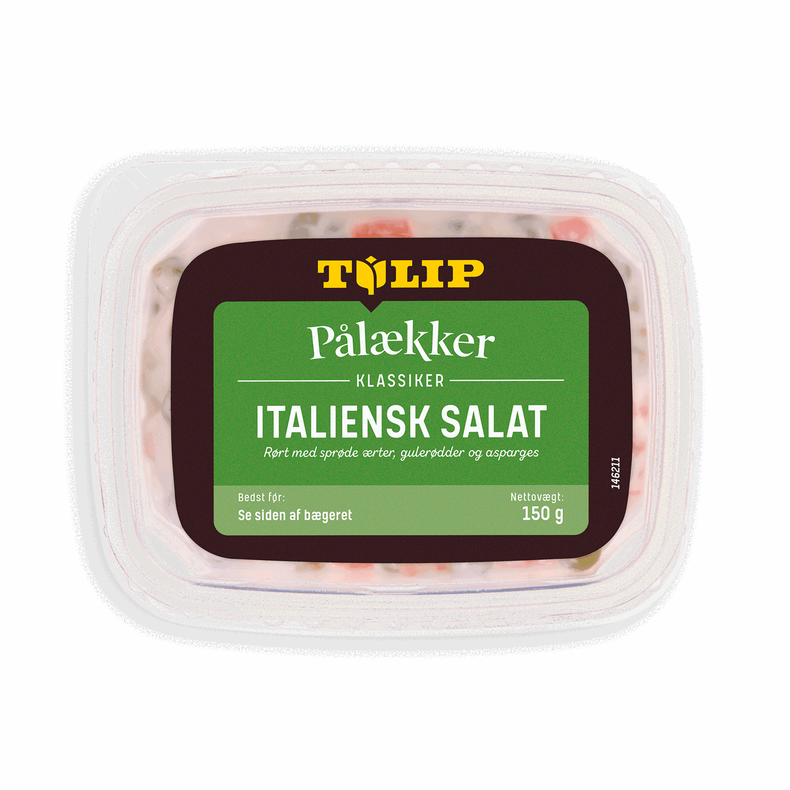 150 gTulip Pålækker Italiensk Salat har en mild mayonnaise-smag med tydelige stykker af gulerødder, asparges og ærter, der alle har det rette bid og smag. Salaten er oplagt som topping på Tulip Pålækker Hamburgerryg eller Rullepølse.