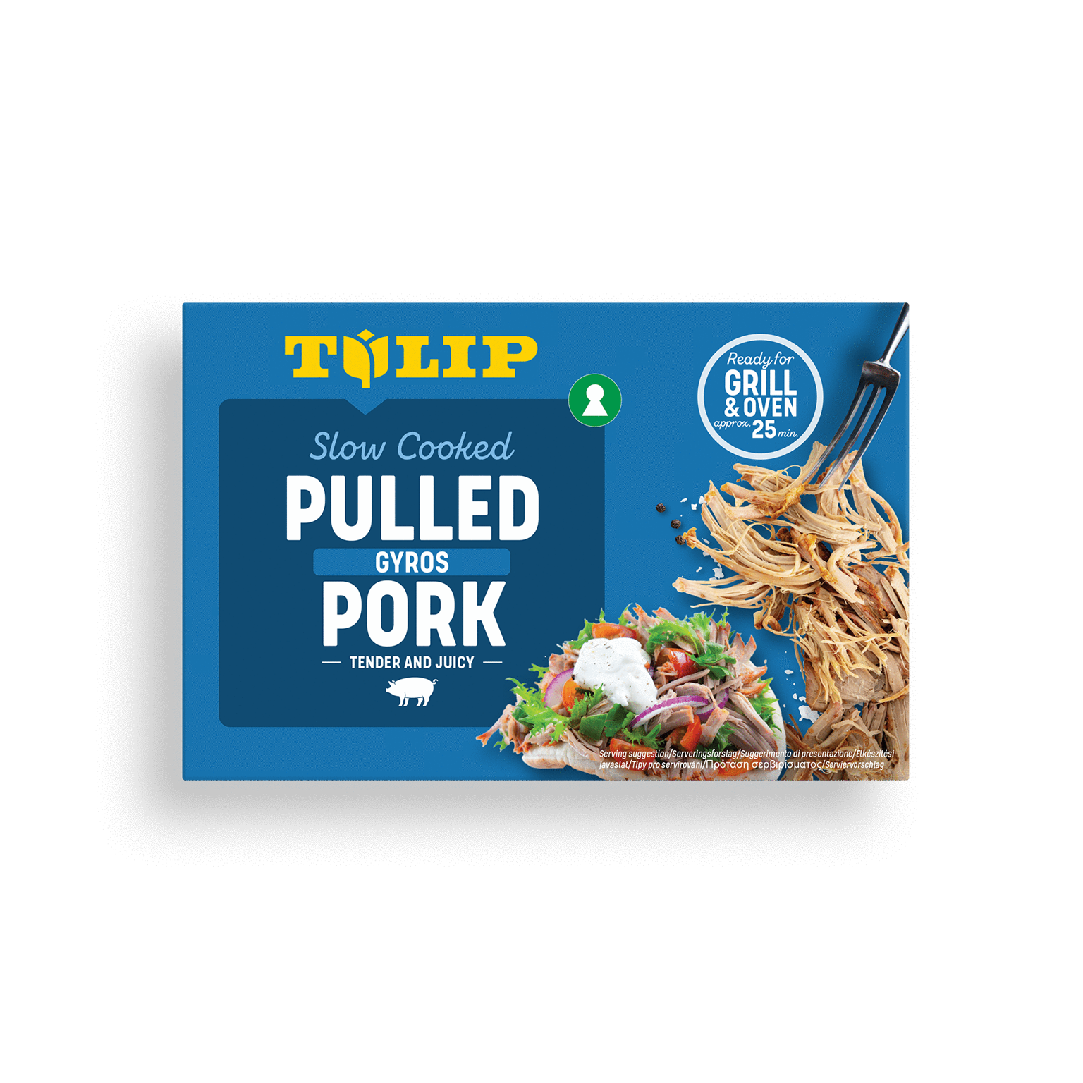 500 gTulip Pulled Pork Gyros er langtidstilberedt grisekød, hvor saft, smag og kvalitet går hånd i hånd. Med inspiration fra det græske køkken er kødet krydret med lækre middelhavs-inspirerede krydderier. Serveres med græsk salat, tzatziki sammen i et fladbrød.