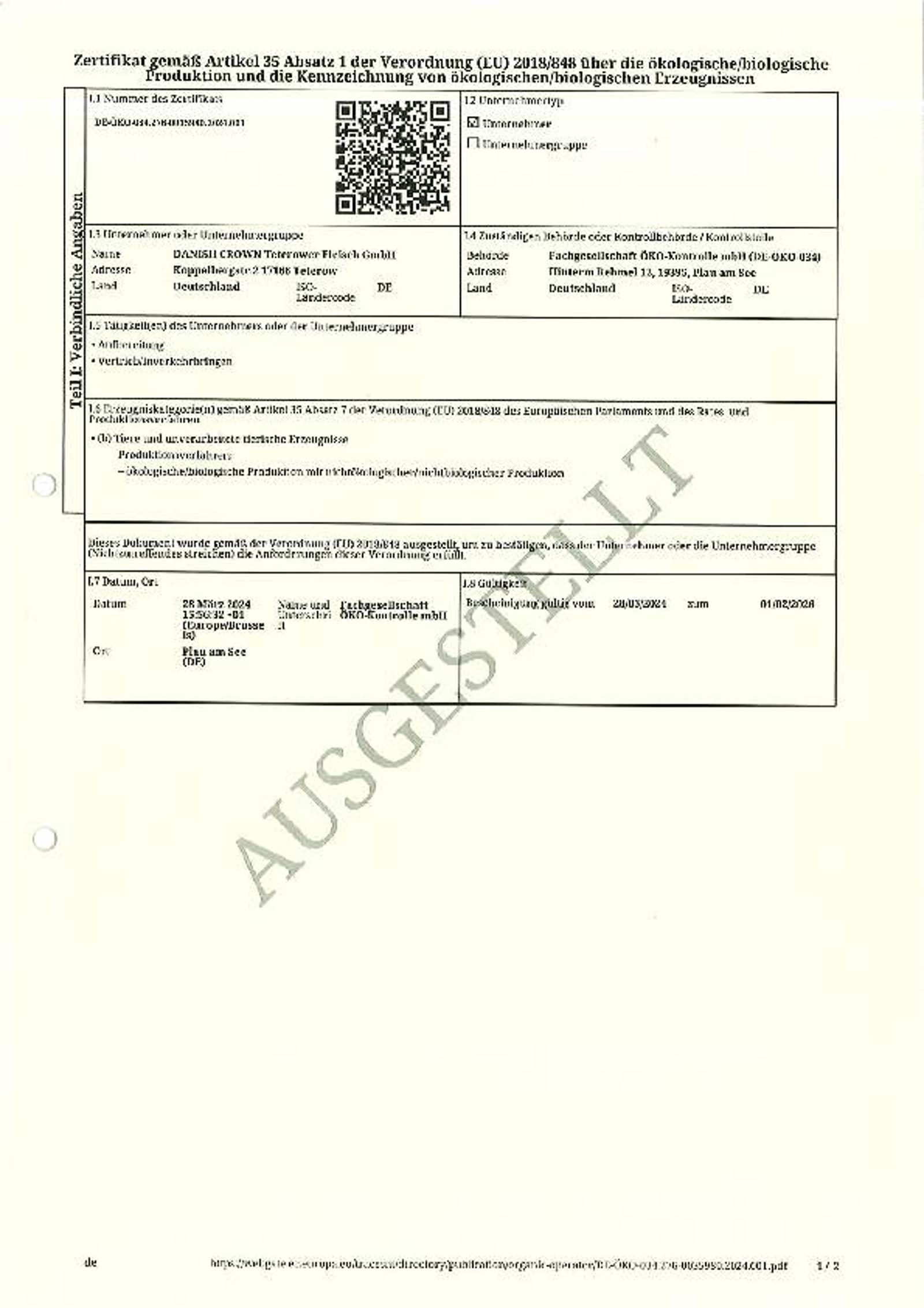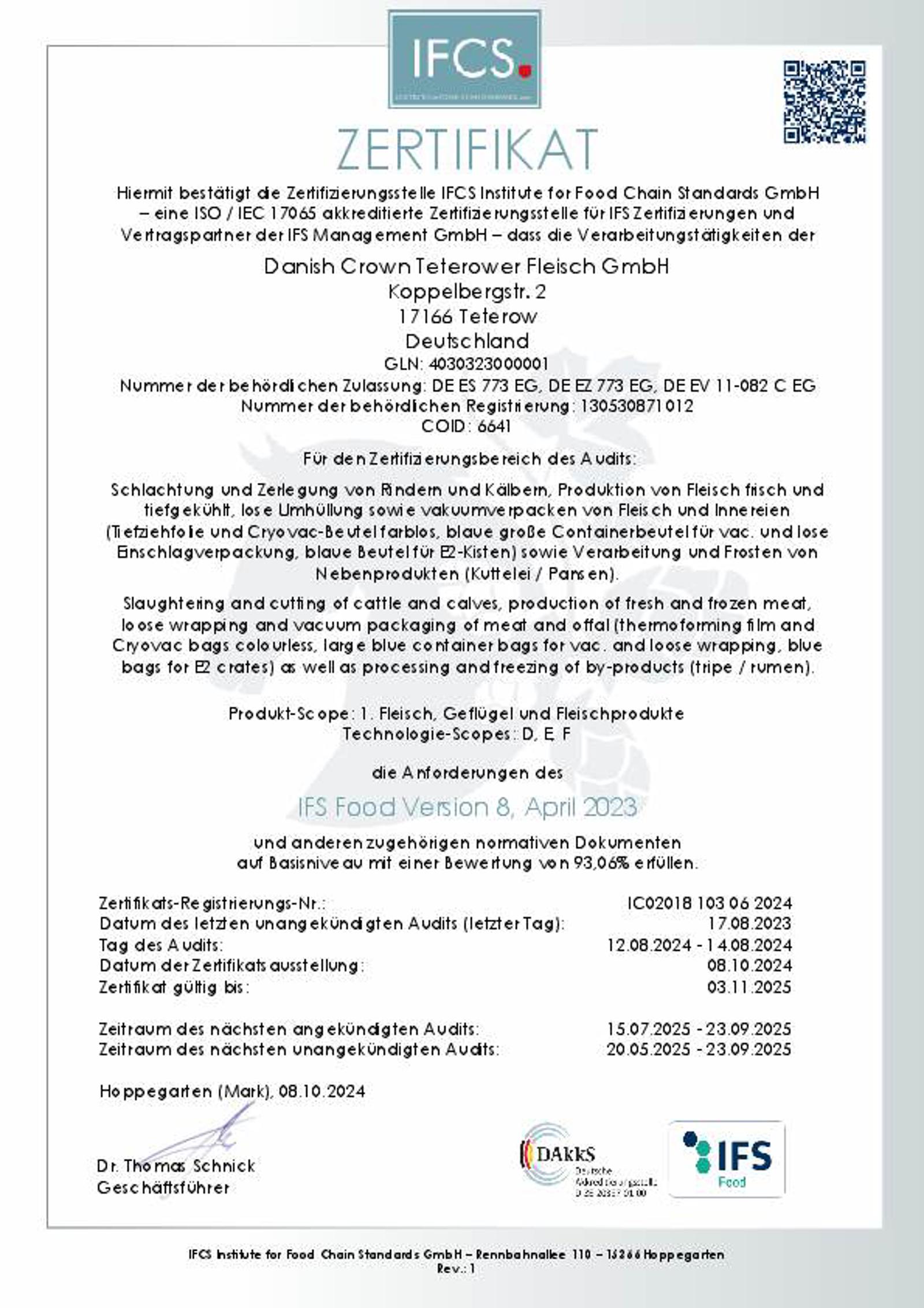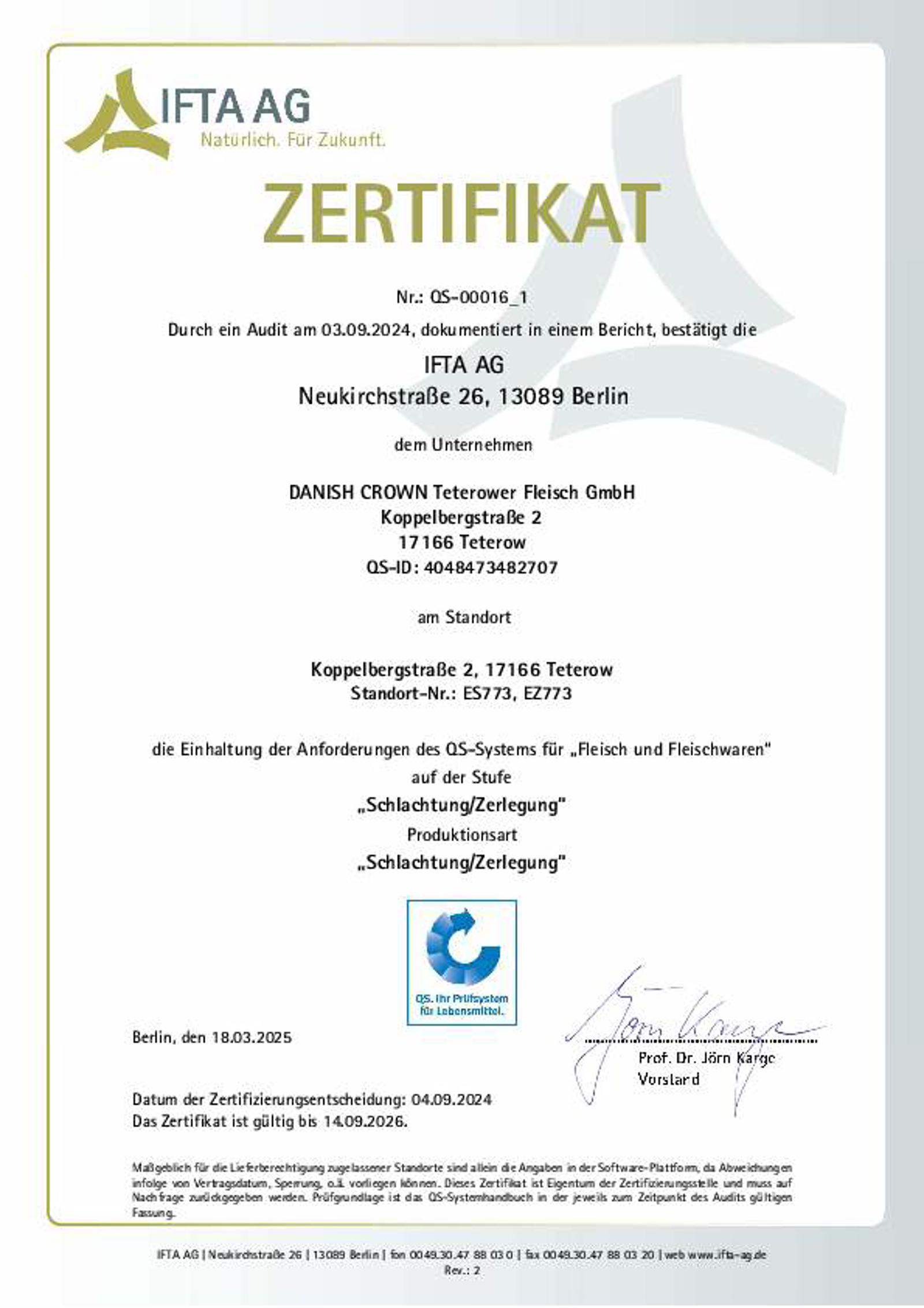 Die Danish Crown Teterower Fleisch GmbH ist nach dem Internationen Food Standard, dem Statut der QS GmbH sowie der Ökoverordnung zertifiziert. Die Qualität und Sicherheit aller Produkte sowie unsere Herstellungsprozesse werden permanent von unabhängigen, privaten Kontrollstellen überprüft. Als Partner des ökologischen Landbaus und seiner leistungsfähigen Erzeugergemeinschaften wird ein Standard garantiert, der über das Niveau der aktuellen EU-VO hinausgeht.