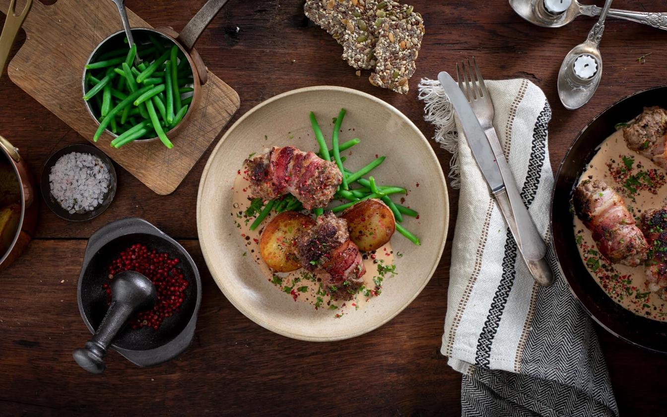 Herzhafte Hacksteaks umwickelt mit knusprigem Bacon, serviert in einer cremigen Sahnesauce – dieses Gericht ist ein echter Familienfavorit. Begleitet von gerösteten Kartoffeln und knackigen Bohnen wird daraus ein wärmendes Wohlfühlessen, das sich perfekt für gemütliche Abende eignet. Die Kombination aus würzigem Hackfleisch, Bacon und sahniger Sauce ist einfach unwiderstehlich!