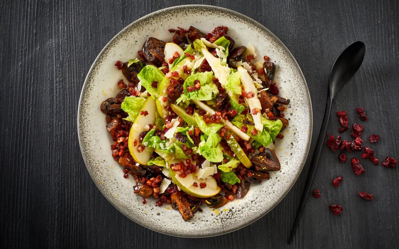 Ein raffinierter Salat, der warm und kalt ein echter Genuss ist! Herzhafte Balsamico-Champignons treffen auf fruchtige Birnenscheiben, süße Preiselbeeren und kross gebratenen Bacon. Ein geschmackvolles Zusammenspiel aus süß, salzig und umami – ideal als leichte Mahlzeit oder als besondere Vorspeise.