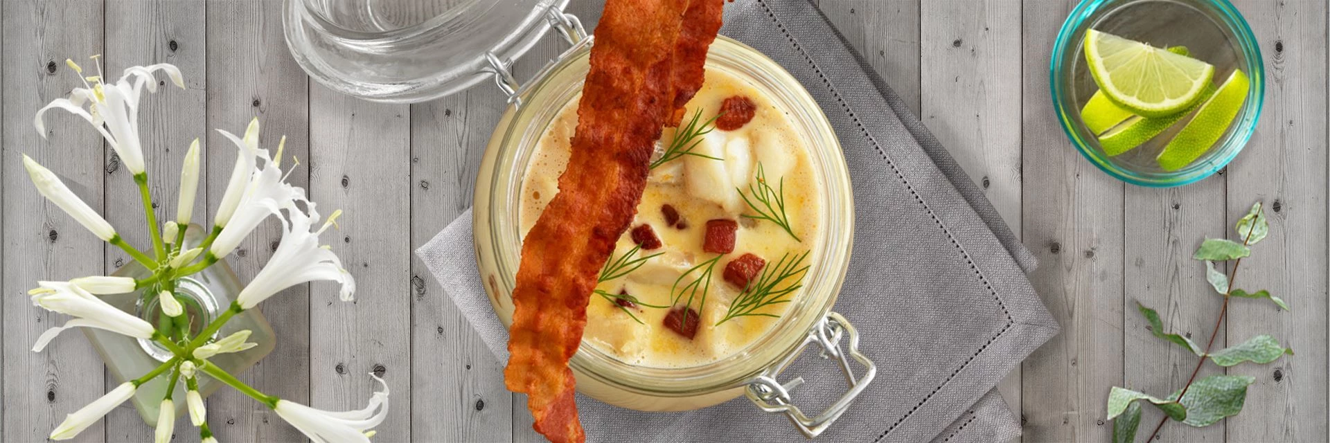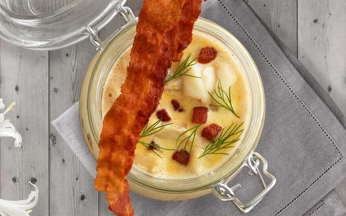 Cremige und schmackhafte Fischsuppe mit Kabeljau, Bacon und sonnengetrockneten Tomaten. Serviert in Serviergläsern mit grüner Dekoration und knusprigem, schmackhaftem Bacon obenauf.