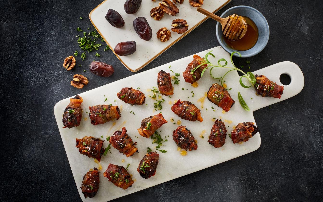 Diese kleinen Häppchen sind der perfekte Mix aus süß, salzig und knusprig: Weiche Datteln, gefüllt mit knackigen Walnüssen und umwickelt mit Bacon – im Ofen goldbraun gebacken und mit einem Hauch Honig und Rosmarin verfeinert. Ideal als Fingerfood, Vorspeise oder zum Aperitif!