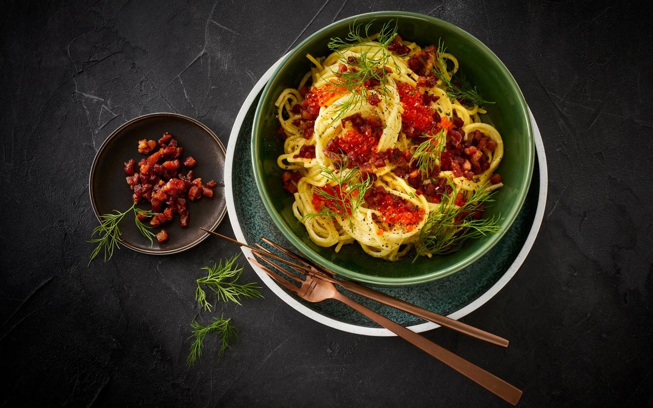 Wenn du Pasta liebst und Lust auf eine außergewöhnliche, aber unkomplizierte Kombination hast, ist dieses Rezept genau das Richtige. Die cremige Senfsoße mit einem Hauch Weißwein umhüllt frische Spaghetti perfekt, während knusprig gebratener Bacon und feiner Forellenrogen für das gewisse Etwas sorgen. Ein schnelles Gericht mit Gourmet-Twist – ideal für den besonderen Abend oder wenn’s einfach mal etwas Besonderes sein soll.