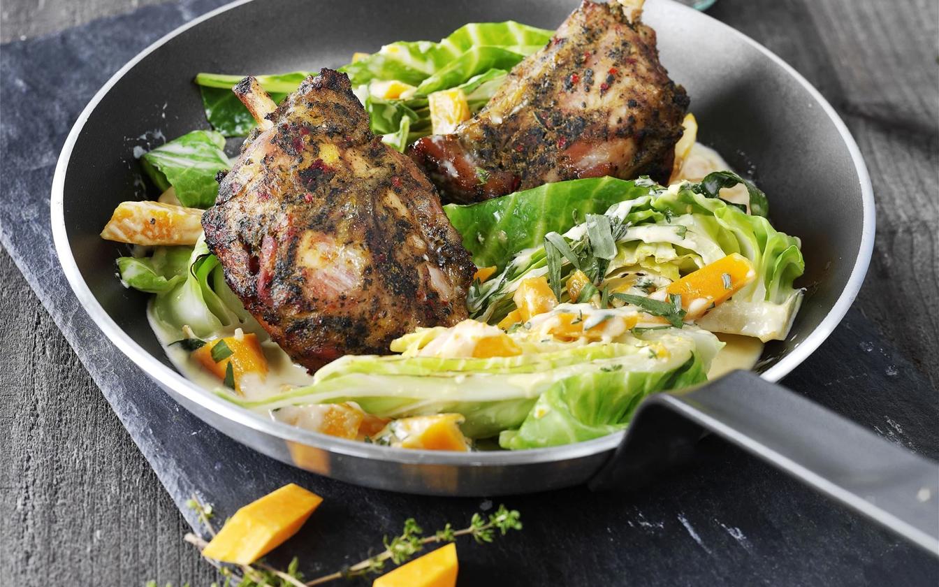 Herzhaft, cremig und voller Aroma: In diesem Gericht vereinen sich zarte Mini-Haxen mit geschmortem Spitzkohl und Hokkaido-Kürbis in einer feinen Zitronenrahmsoße. Frische Kräuter wie Estragon und Thymian runden den Geschmack perfekt ab. Eine schnelle und elegante Mahlzeit – ideal für gemütliche Abende oder wenn du Gäste beeindrucken möchtest.