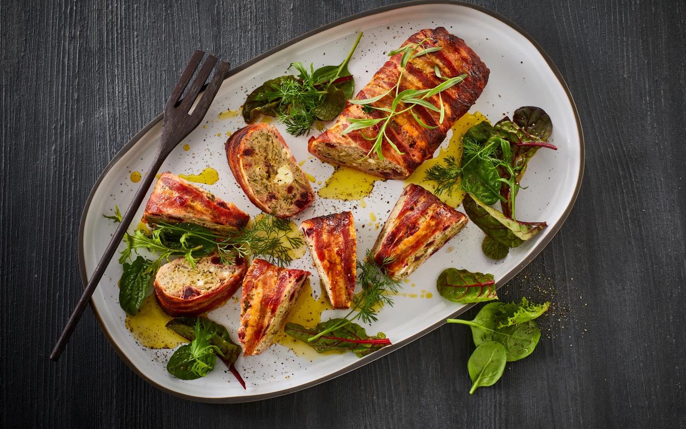 Ein klassischer Hackbraten bekommt hier ein raffiniertes Update: Mit eingelegter Roter Beete, salzigem Feta, frischer Petersilie und würzigen Kapern wird dieser saftige Braten zum Highlight. Umhüllt von knusprigem Bacon bleibt das Innere herrlich zart – perfekt für ein gemütliches Abendessen oder den Sonntagsbrunch mit der Familie.