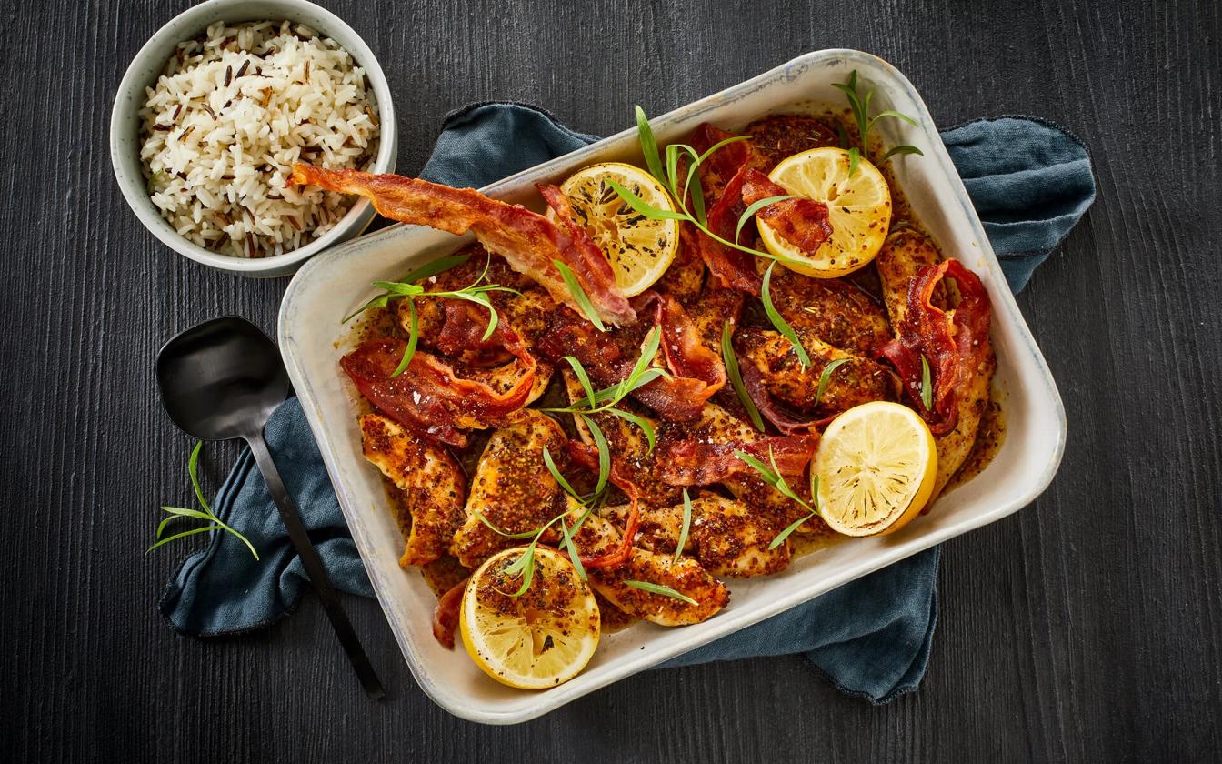 Hähnchenbrust im Speckmantel bildet die perfekte Kombination aus zartem Hähnchen und dem intensiven Geschmack von salzigem Bacon. Bereit für einen Extra-Tipp: Zitrone und Estragon verleihen der Hähnchenbrust im Backofen zusätzlich eine aromatisch fruchtige Note.