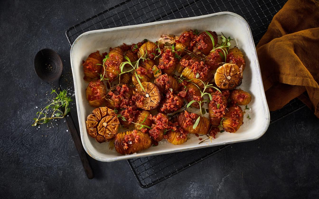 Außen knusprig, innen wunderbar zart – Hasselback-Kartoffeln sind ein echter Klassiker aus dem Ofen. Mit aromatischen Kräutern, geröstetem Knoblauch und knusprigen Baconstreuseln werden sie zum perfekten Begleiter für Fleisch, Fisch oder als Highlight auf dem Buffet.