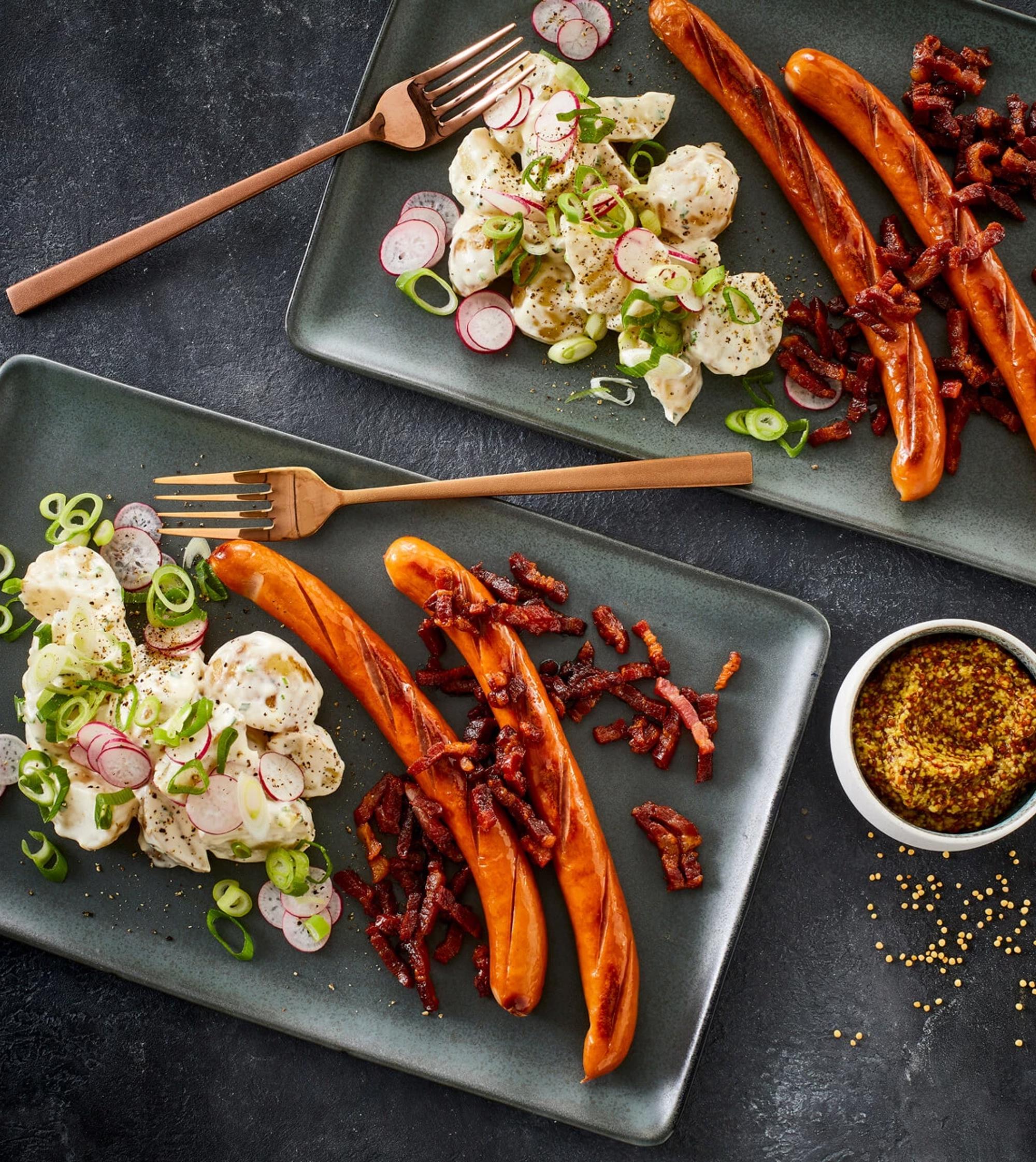 Einfach mal selbermachen: Haugemachte Würstchen mit Kartoffelsalat und knusprigem Bacon. Verleih deinen Kochkünsten ein Upgrade mit diesen Würstchen und hausgemachtem Kartoffelsalat. So gelingt dir das Gericht ganz einfach.