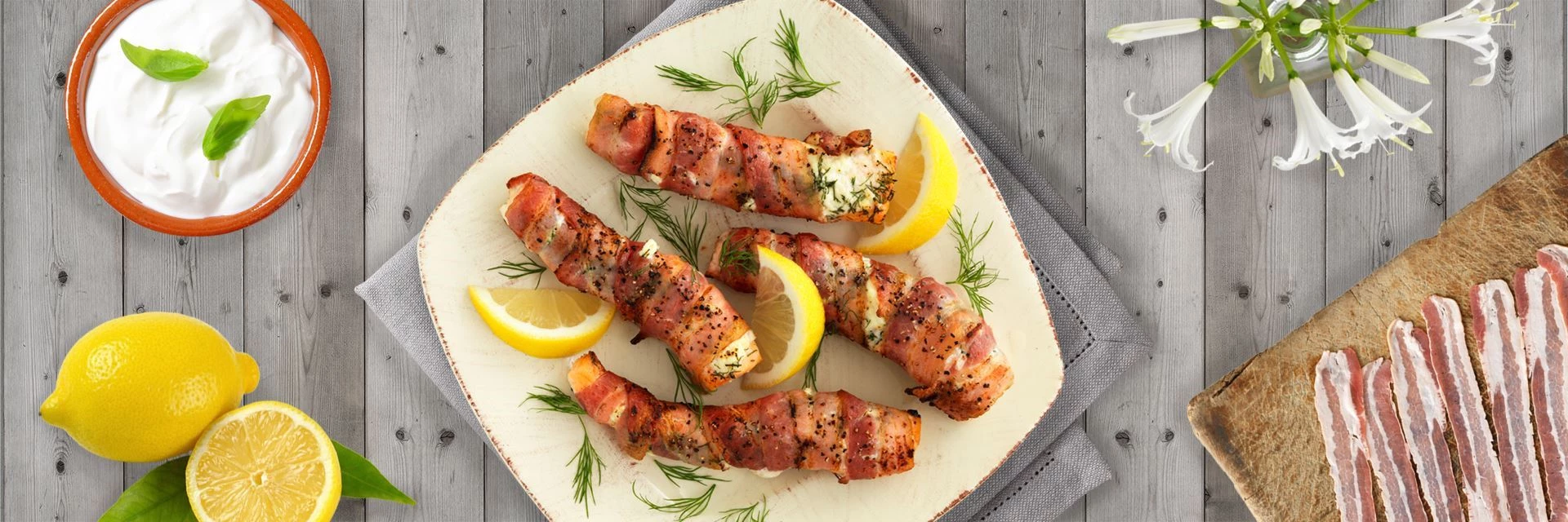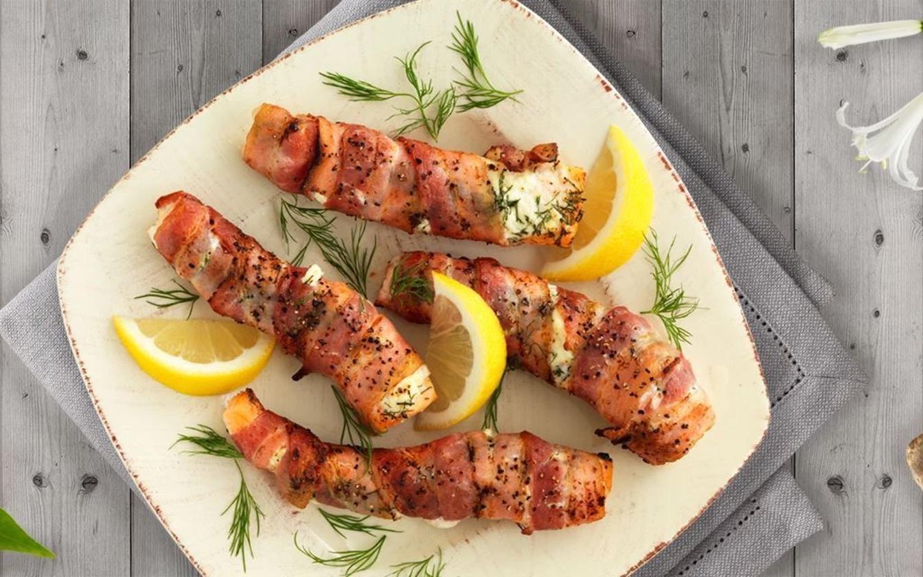 Leckeres und saftiges Lachsfilet in dicken Streifen, gewürzt mit Frischkäse, Dill und geriebener Zitronenschale. Dann werden sie mit Bacon-Scheiben umwickelt und im Ofen gebacken.