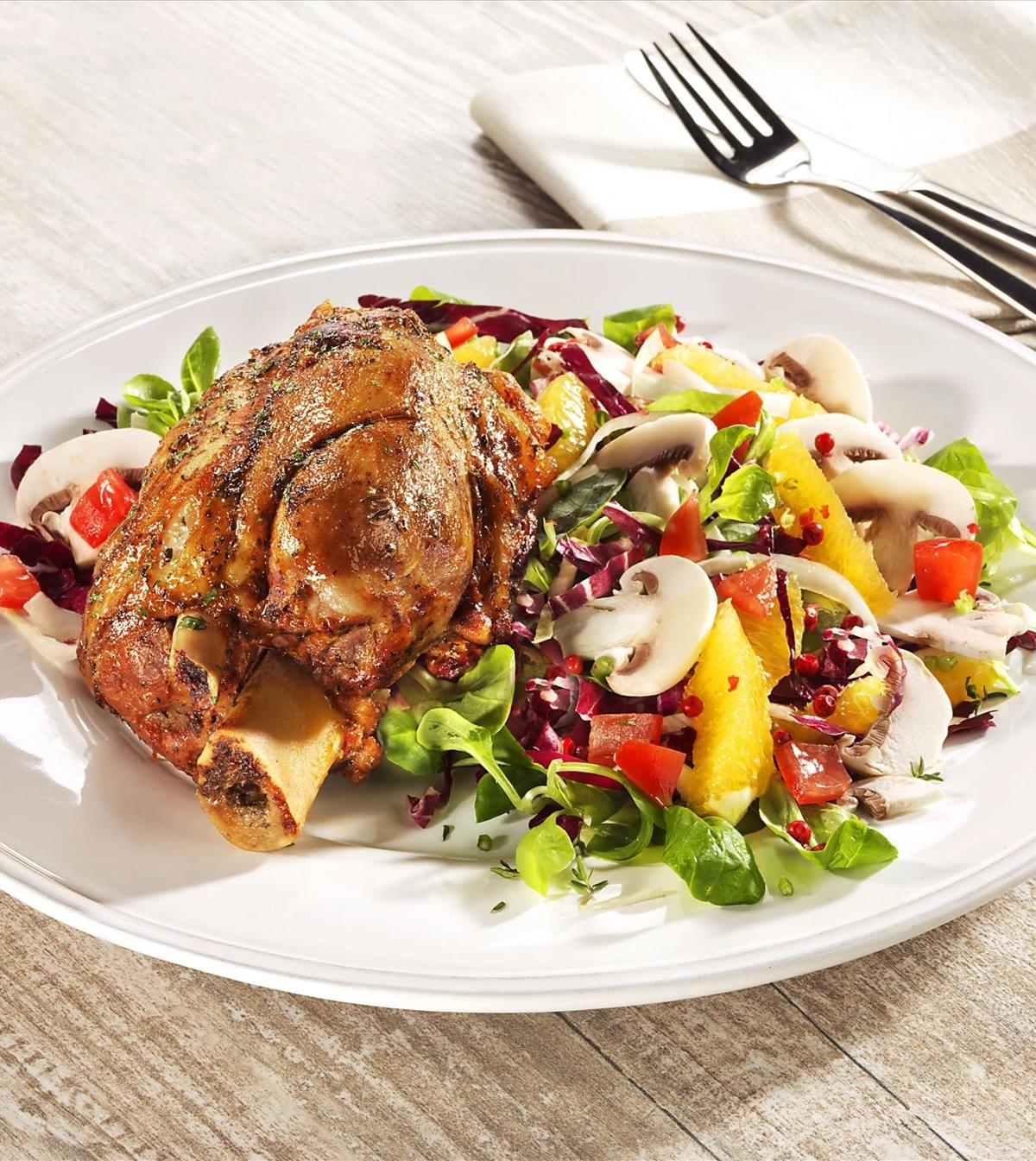 Ein Gericht mit Fernweh-Garantie: Unsere zarten Mini-Haxen treffen auf eine aromatische Tandoori-Tomatensauce mit Kokosmilch, Jasminreis und knackigen Zuckerschoten. Dieses Curry-inspirierte Gericht ist einfach zubereitet, voller Geschmack und wird zusammen mit warmem Naan-Brot zum echten Genussmoment. Ideal für alle, die Abwechslung lieben.