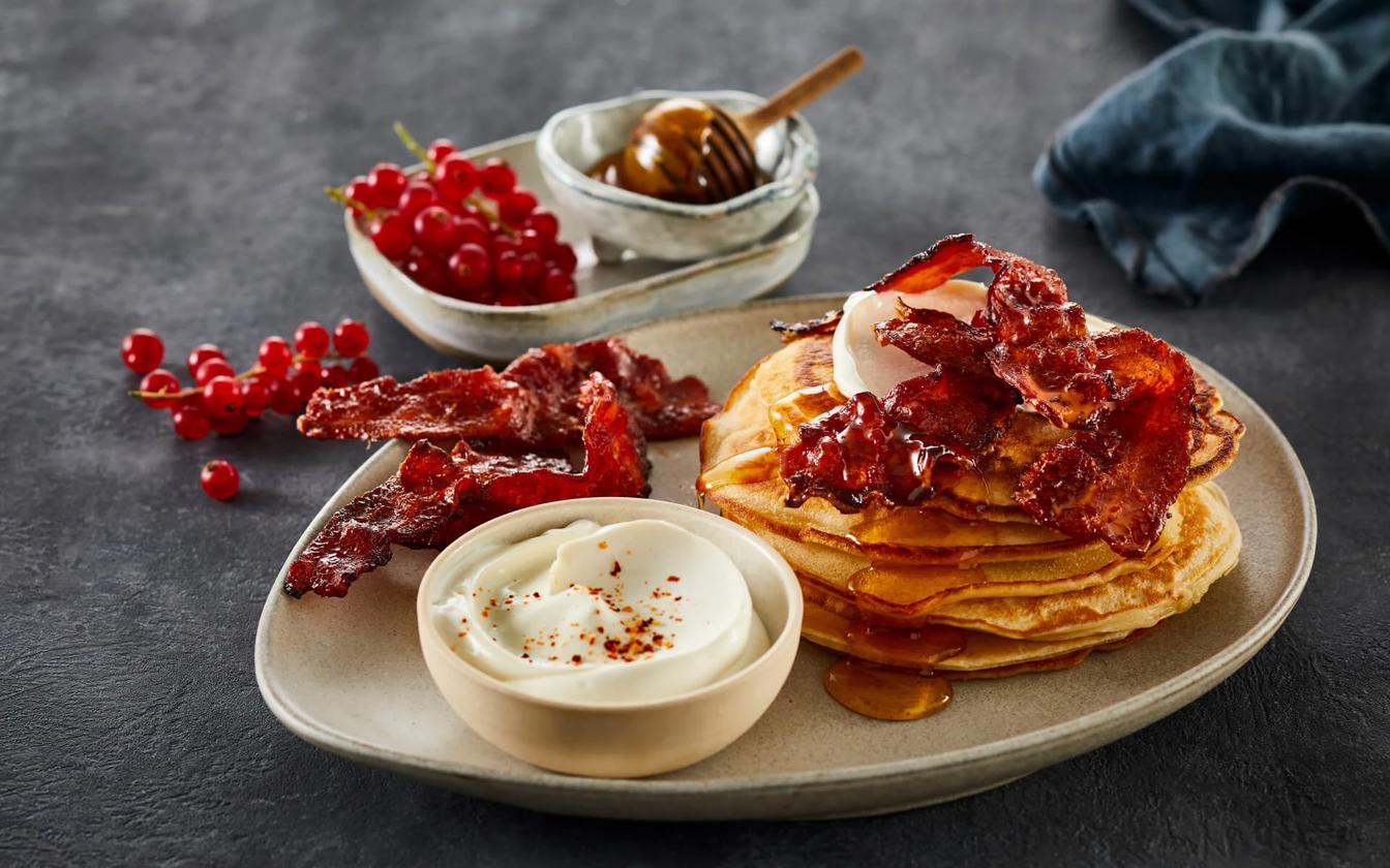 Serviervorschlag: Pfannkuchen mit Frischkäse, Ahornsirup und den knusprigen, glasierten Baconstreifen servieren. Nach Belieben mit frischen Johannisbeeren dekorieren.