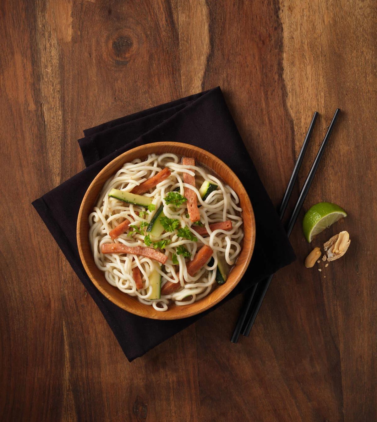 Pasta is classic comfort food that you can serve in a variety of ways any day of the week. Try out this simple spaghetti with pork luncheon meat in tomato sauce for a quick, easy, and delicious dinner. The meal consists of long ribbon-style Tagliatelle and a savory tomato sauce with pork, mushrooms, celery, carrots, onion, and garlic.
