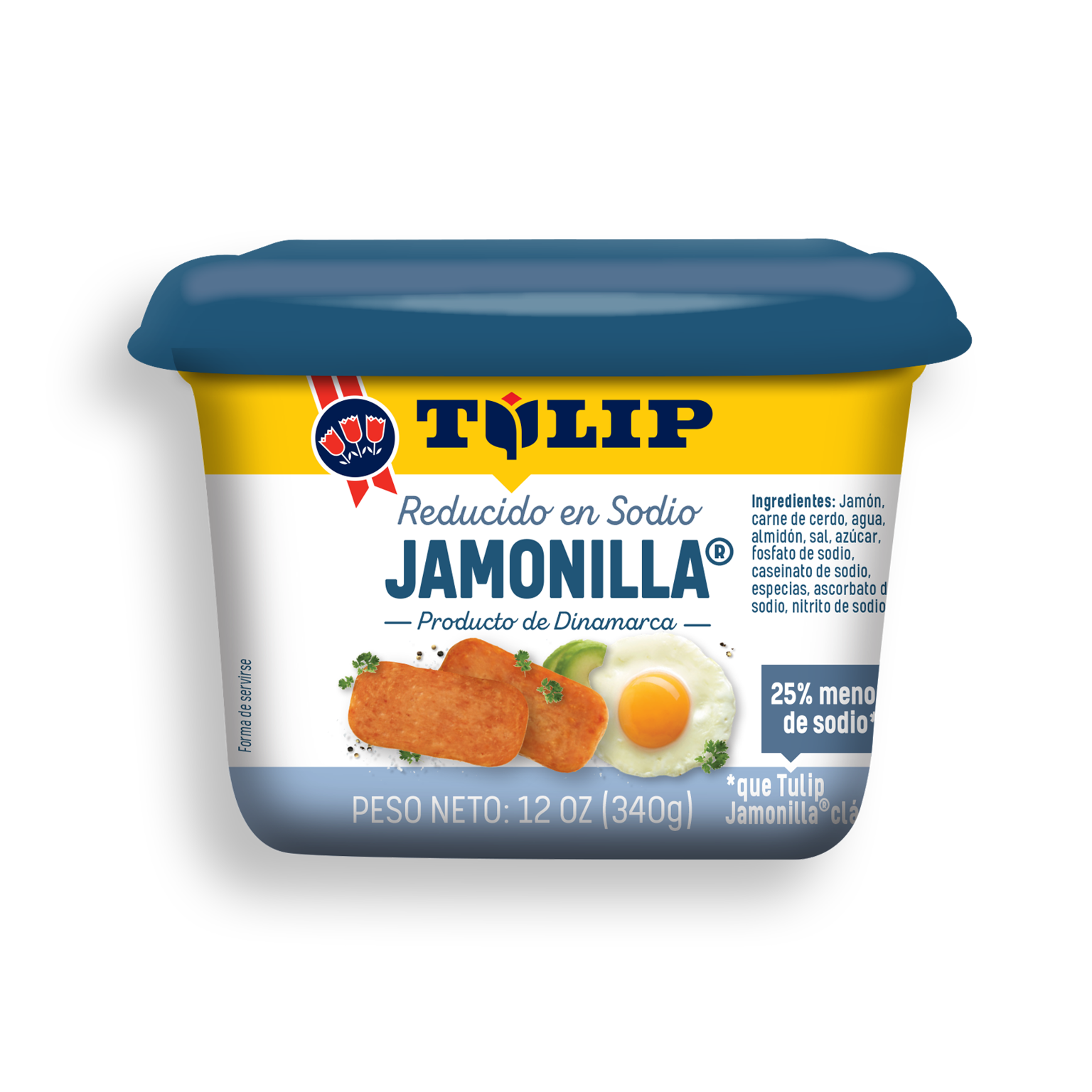 12 ozThis product contains 25% less sodium than the original Tulip Jamonilla® making it a healthier choice for you. It is available in the innovative plastic container; it's easy to open, suitable for heating in the microwave, and it can be used for leftovers.