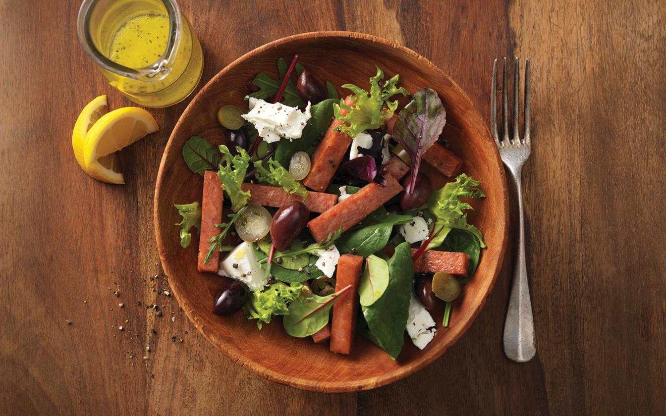 Esta deliciosa y sencilla ensalada de Jamonilla con queso feta, aceitunas, chiles en vinagre, pan con Jamonilla y aceite de oliva está inspirada en la cocina griega. Es muy fácil de preparar, ya que sólo requiere un poco de picado y una mezclada rápida. Nunca se tienen demasiadas recetas de ensaladas y ésta es perfecta para añadir a tu artillería de cenas fáciles entre semana.