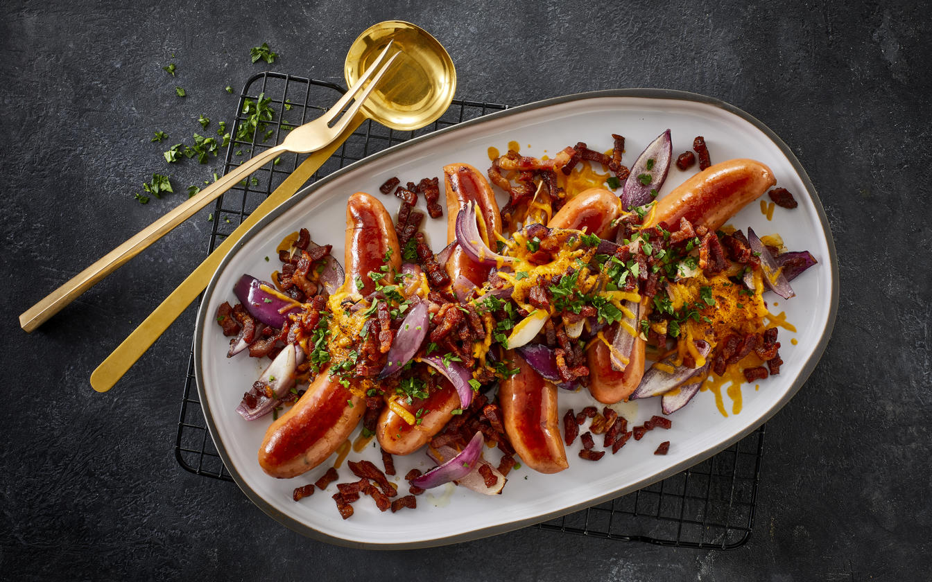 Kiireisessä arjessa, kun aikaa on usein vähän, tämä helppo resepti on voittaja. Se yhdistää mehukkaat bratwurstit rapean pekonin ja sulatetun cheddar-juuston kanssa, kaikki valmistuu nopeasti. Punaiset sipulit ja tuore persilja antavat ruoalle lisämakua. Täydellinen, kun haluat tehdä vaikutuksen perheeseen ja ystäviin maukkaalla illallisella käyttämättä liikaa aikaa keittiössä.