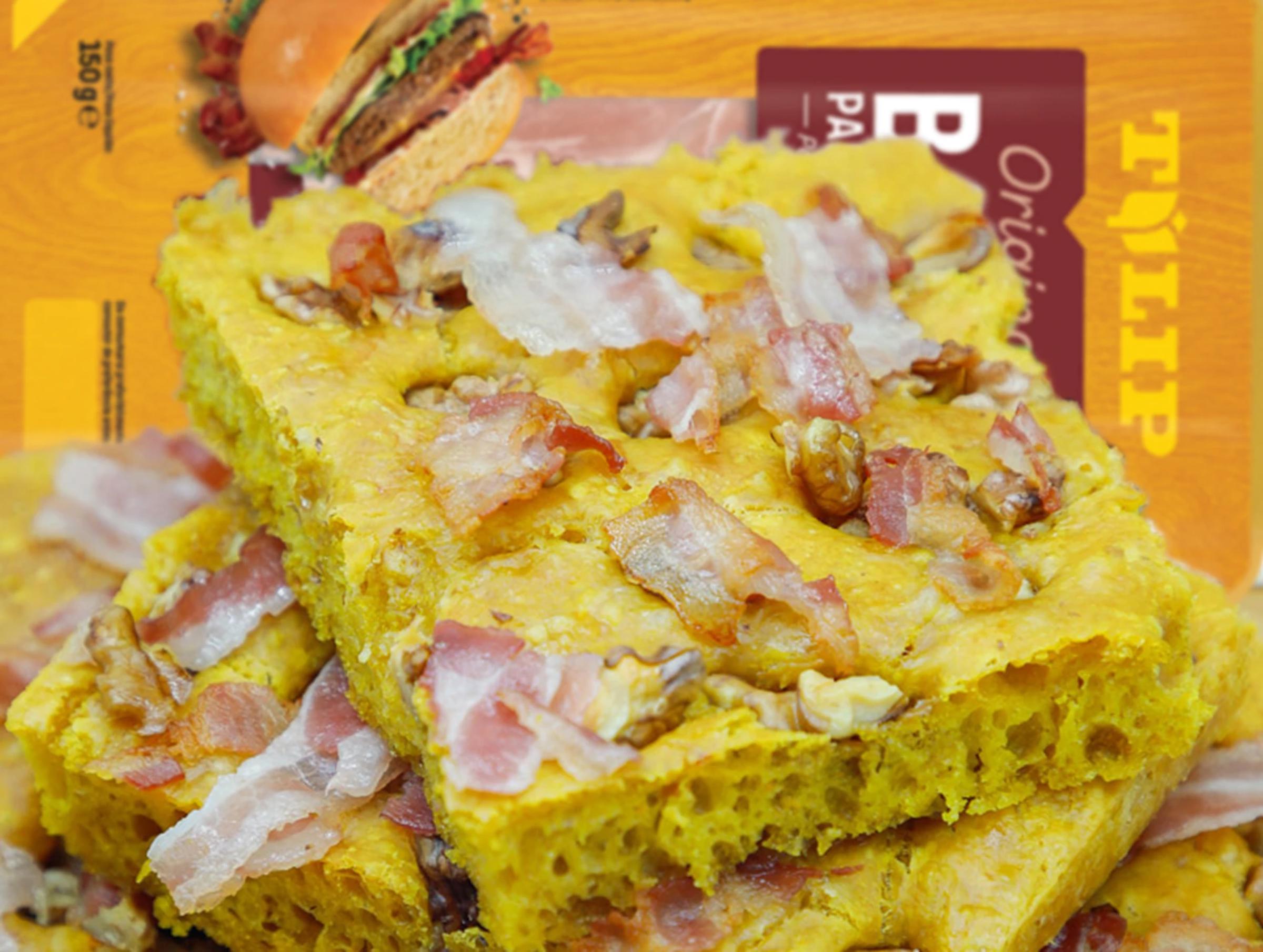 - Dopo questa lievitazione, riempire la superficie della focaccia con olio e sale e inserire le noci. Cuocere in forno ventilato a 230°C per circa 25 minuti nella parte media del forno. Quando mancano 10 minuti alla fine della cottura, riempire la superficie della focaccia con abbondante bacon e pezzi e ripassare in forno fino a terminare la cottura.