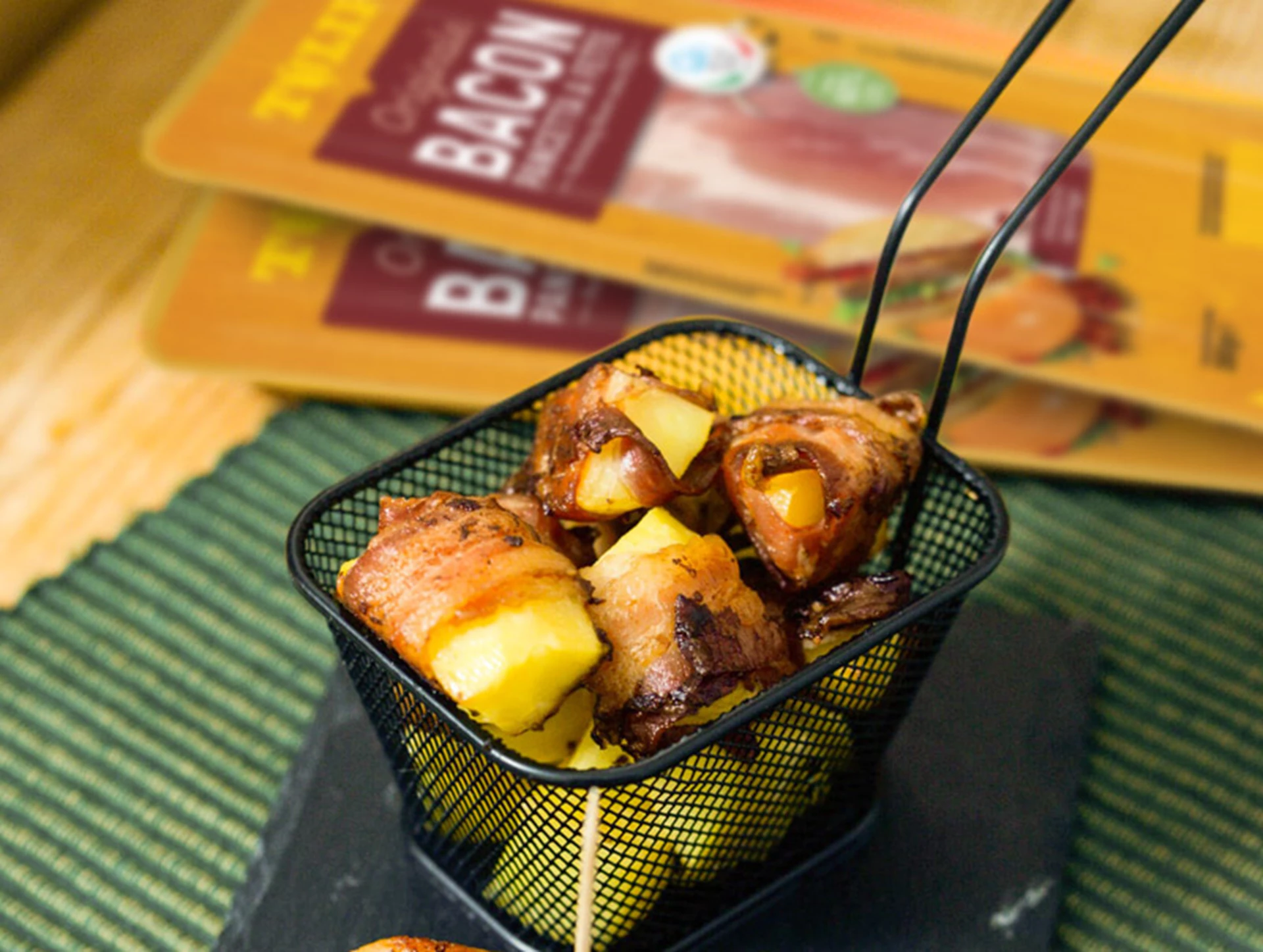 - Avvolgere ogni spicchio di patata con il Bacon Tulip.