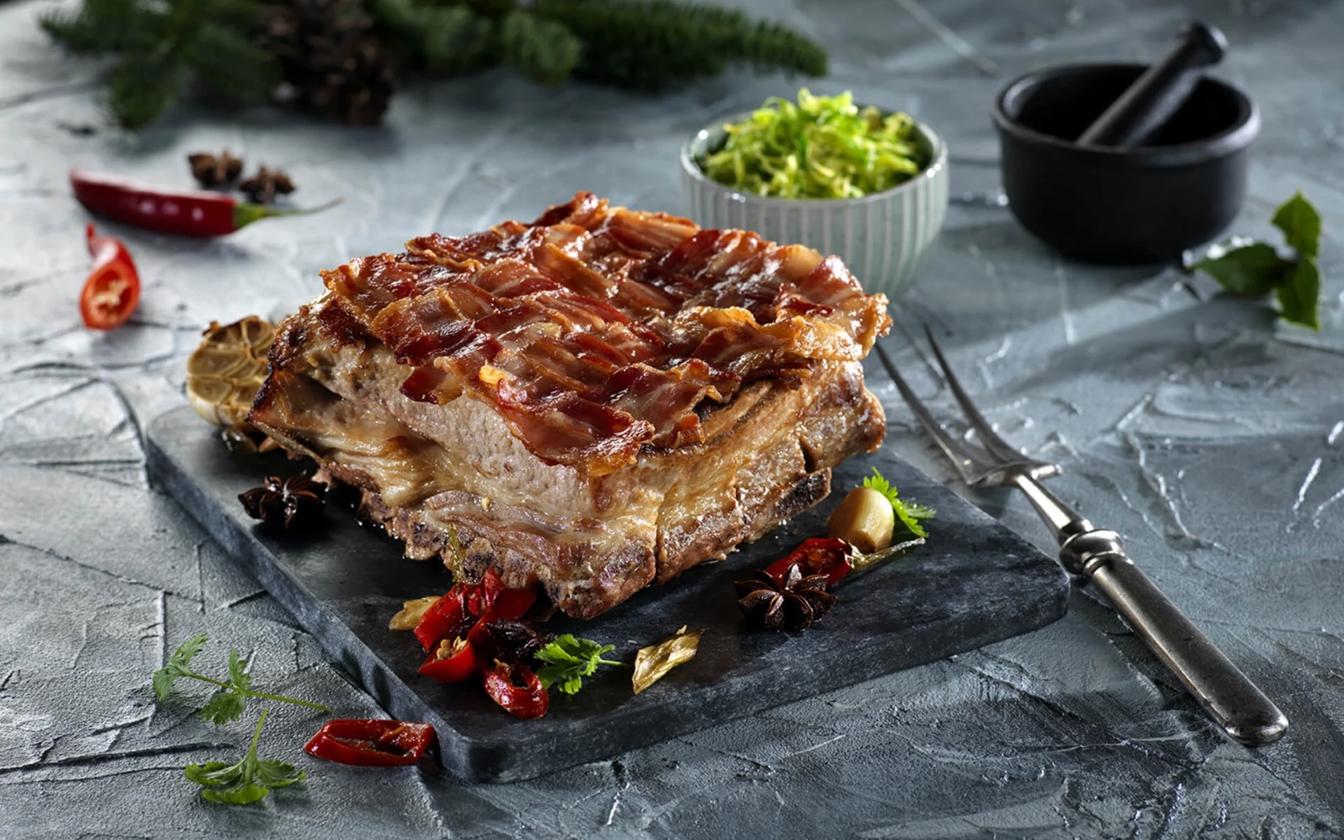 Gi den klassiske ribben et moderne løft med en asiatisk inspirert marinade og en dekorativ baconflette på toppen. Denne smakfulle retten kombinerer mørt svinekjøtt med en sødmefylt marinade av cola, hvitløk, chili og stjerneanis – og toppes med sprø Tulip bacon. Perfekt til både høytid og helgekos!