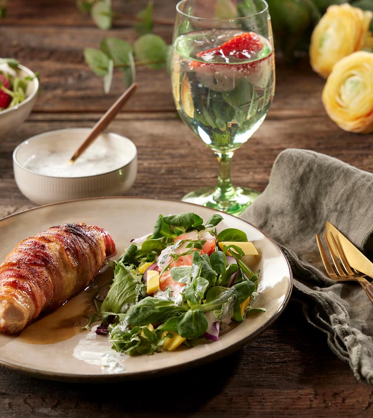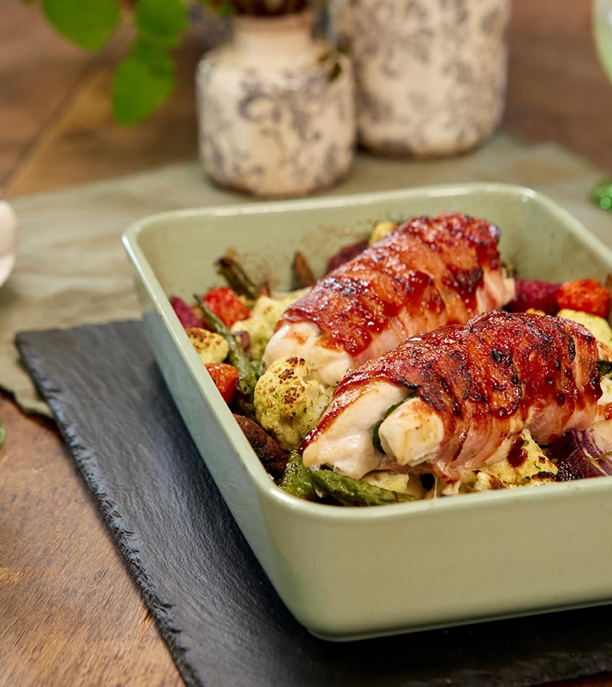 Baconsnurret kyllingfilet med mozarella og søtpotet