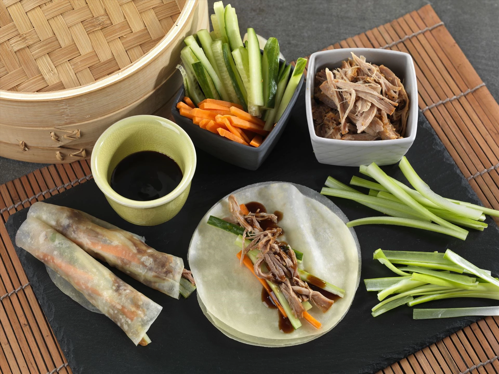 La folk fylle sin egen pannekake med crispy pulled pork, og det de liker av råvarer, toppes med Hoisinsaus.
