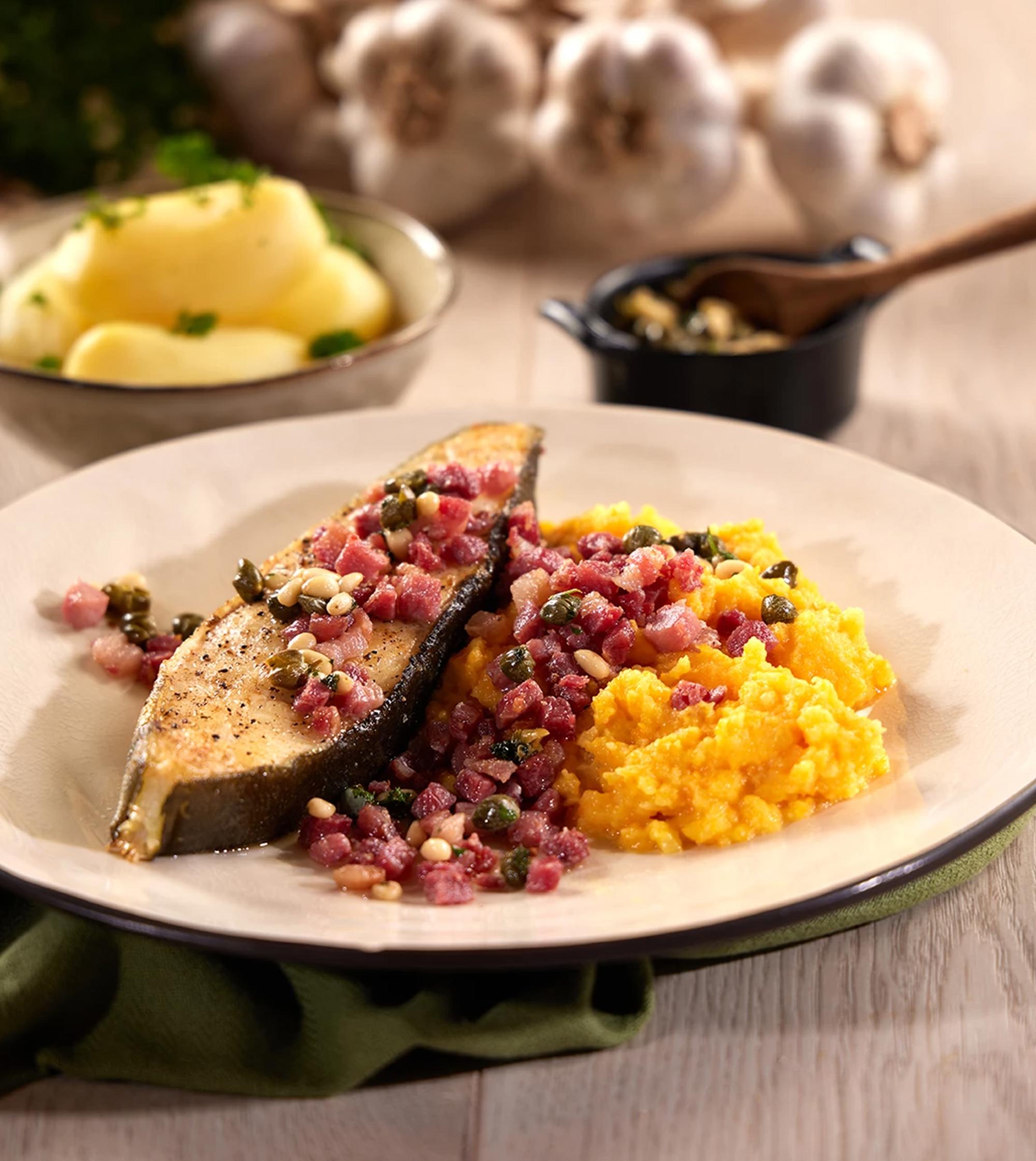 Pannestekt kveite med rotmos og pancetta