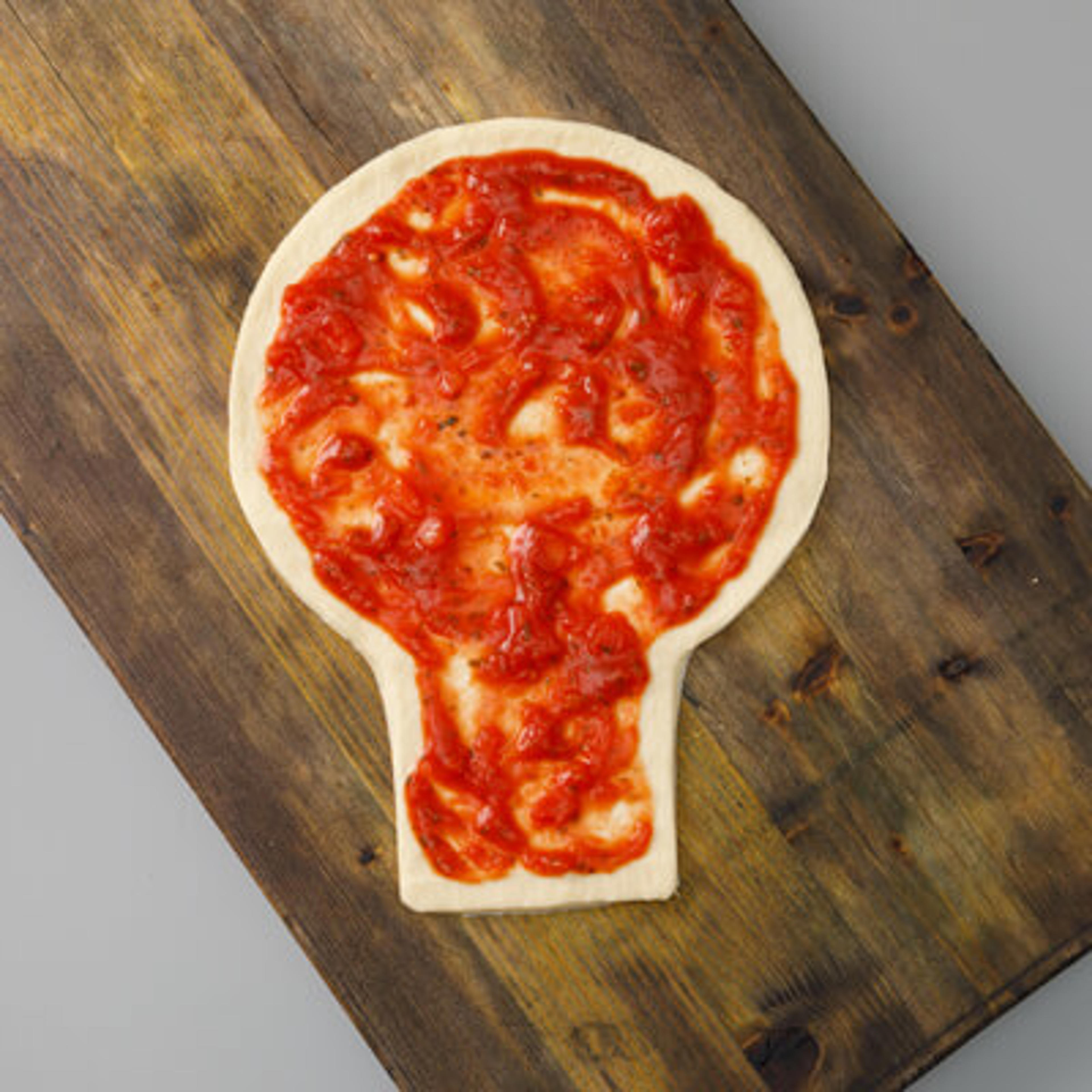 Vi har brukt ferdig pizzadeig, men hjemmelaget tomatsaus. Du kan også kjøpe en ferdig pizzasaus hvis du ønsker raskere resultater.