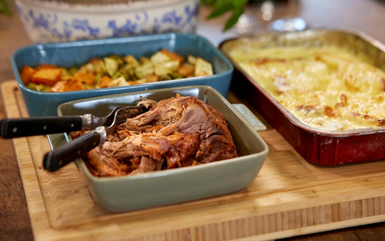 Pulled Pork med bakte grønnsaker og fløtegratinerte poteter