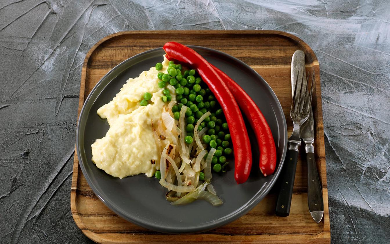 En klassisk og enkel rett med Tulip Røde Pølser servert på ekte engelsk vis. Saftige pølser får følge av kremet potetmos, søte erter og en fyldig løksaus – en kombinasjon som passer perfekt til både hverdagsmiddag og helgekos.