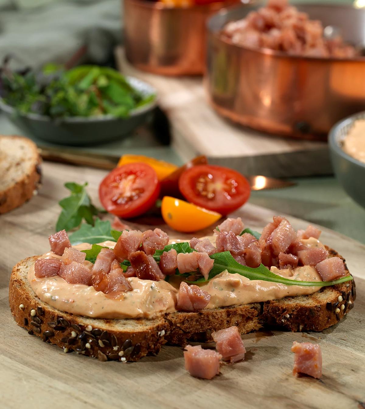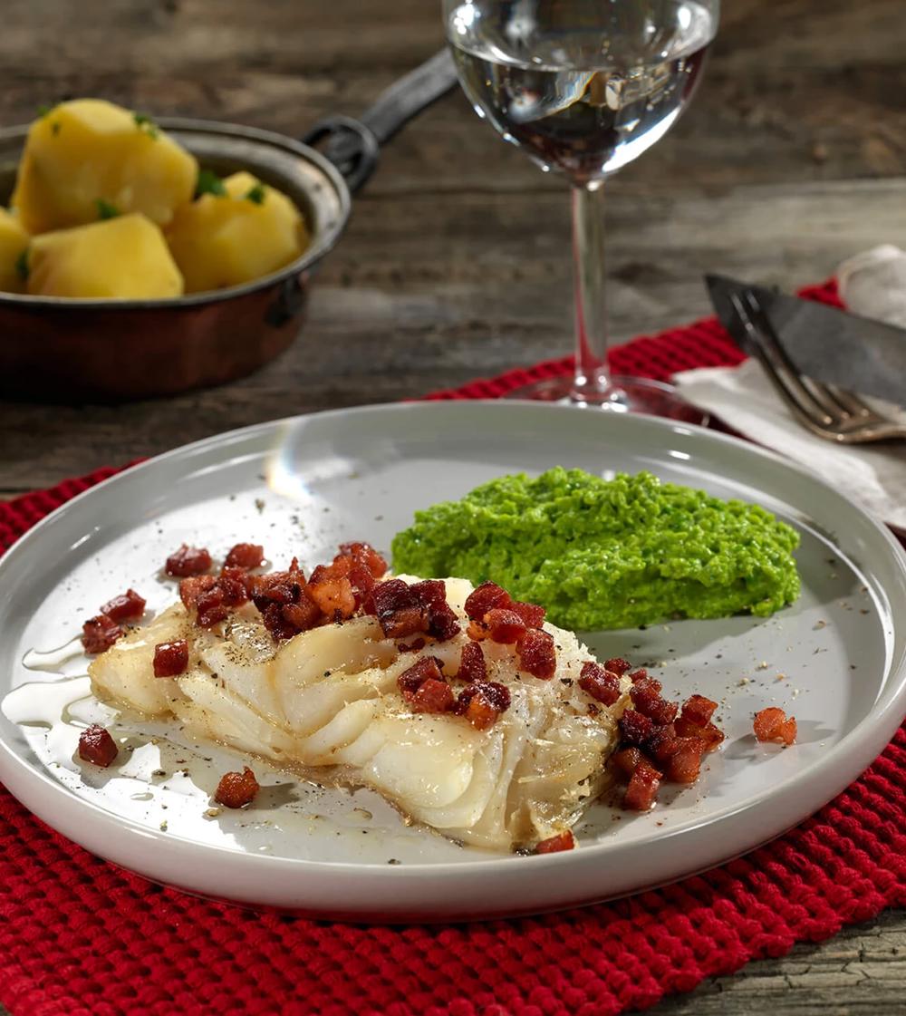 Denne retten kombinerer saftig steinbitfilet med ovnsbakte cherrytomater og sprøstekt Tulip ternet bacon smaksatt med frisk estragon. Grillet sitron tilfører et syrlig løft som balanserer retten perfekt. En enkel og imponerende fiskemiddag som passer til både hverdag og helg.